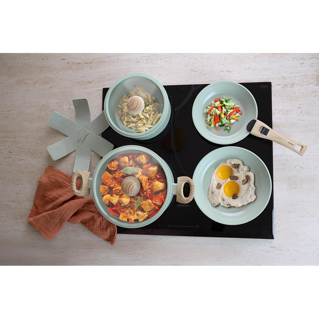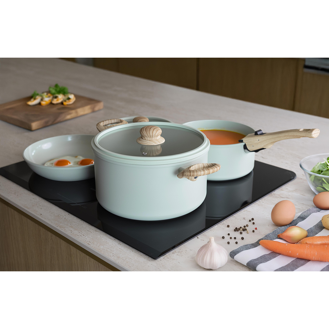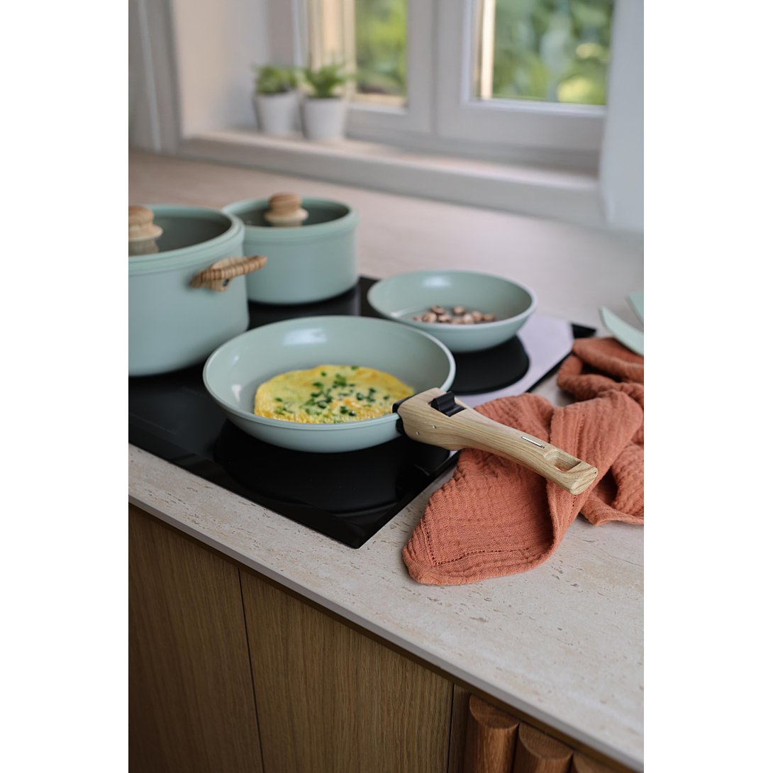 Batterie de cuisine empilable 8 pièces en aluminium forgé d'épaisseur 3mm Revêtement intérieur anti-adhésif en céramique Compatible avec tous les feux, dont l'induction Solution pratique et efficace pour ceux qui recherchent à la fois fonctionnalité et gain d'espace Optez pour la praticité, l'efficacité et la durabilité Une gamme performante, élégante et design, qui deviendra indispensable pour cuisiner vos préparations ! Sa conception en aluminium favorise une diffusion homogène de la chaleur, pour des cuissons optimales. Grâce à son revêtement antiadhésif, vos aliments n'accrochent pas et son nettoyage est facilité. L'intérieur est recouvert d'un revêtement céramique coloré, l'extérieur est recouvert d'un revêtement résistant à la chaleur, fond à induction. Ensemble comprenant deux poêles de 20 et 24cm, une casserole de 20cm, une cocotte de 24cm avec deux poignées latérales en bakélite finition bois et deux couvercles en silicone de 20 et 24cm ainsi qu'une poignée amovible en bakélite finition bois. Entretien : Compatible avec le lave vaisselle Lavage à la main recommandé pour la poignée