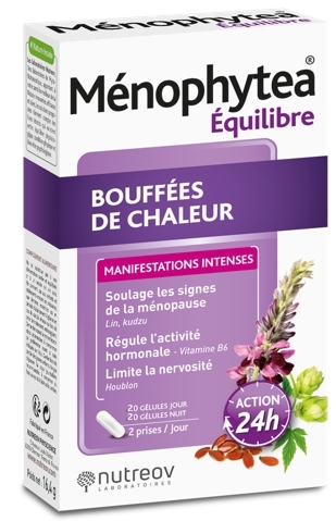 Nutreov Ménophytea Bouffées de Chaleur 40 Gélules est un complément alimentaire à prendre dès les premiers symptômes de la ménopause, dus aux changements hormonaux qui s'opèrent dans le corps. Ménophytea aide à réduire ces désagréments. Il associe deux formules innovantes pour aider à réduire ces désagréments. En effet, la complémentarité de ces deux formules permet une diffusion prolongée des actifs et une action optimale tout au long du jour et de la nuit. 20 gélules jour pour une action contre les bouffées de chaleur en journée, et 20 gélules nuit pour combattre les suées nocturnes et ainsi retrouver un sommeil apaisé et reposant.