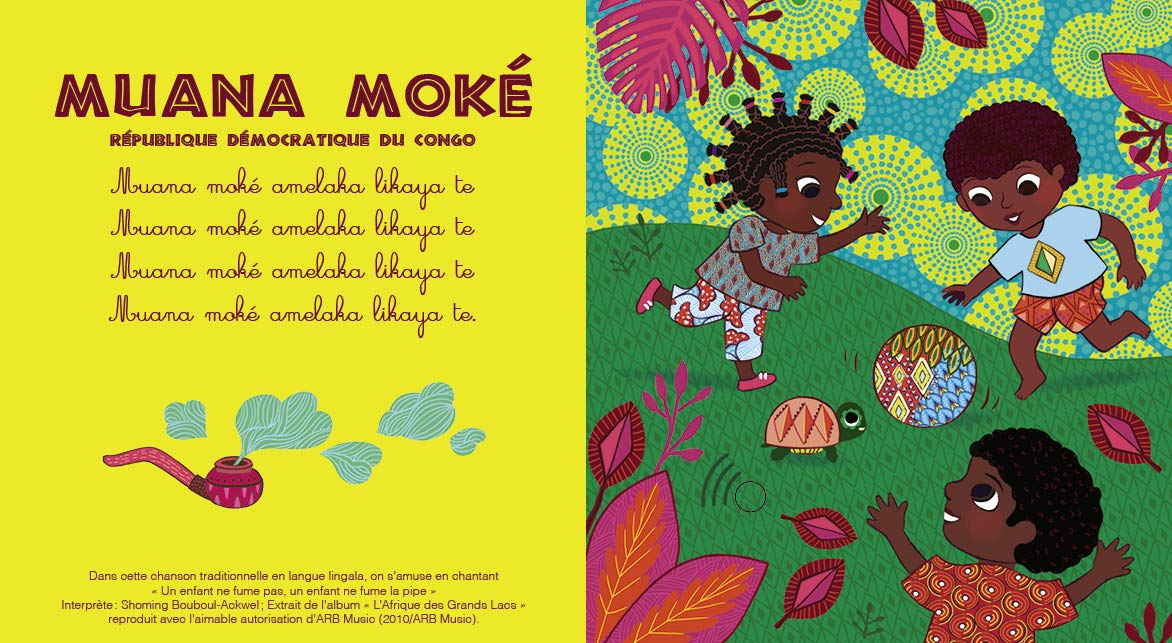 C'est au travers des classiques du répertoire des chansons africaines pour les enfants collectées par ARB Music, que les petits écouteront et découvriront : Muana Moké, Mami Wata, Amina, Pililili, MamaYaka et Kélélèh. Les illustrations joyeuses et colorées de Sophie Rohrbach accompagnent cette découverte.