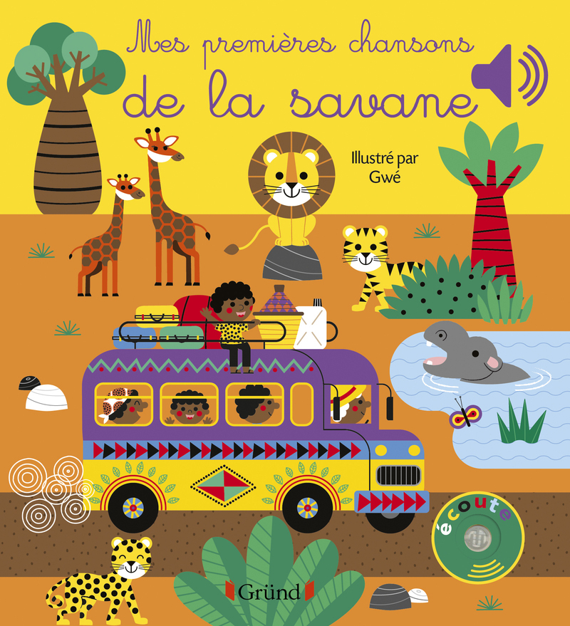 Les illustrations gaies et colorées de Gwé accompagnent cette escapade musicale dans la savane.