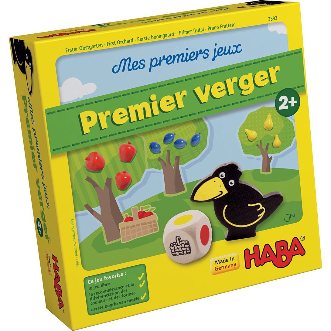 à partir de 2 ans moins de 30 min 1 à 4 joueur(s) Mes premiers jeux – Mon premier verger est une adorable version pour bambins du jeu classique HABA >. Les enfants parviendront-ils à cueillir ensemble les fruits avant que l'effronté corbeau Théo n'atteigne le verger ? Le dé indique que l'on cueille un fruit ou que le corbeau futé s'approche. Le lancer du dé et le classement stimulent une première reconnaissance et la désignation des couleurs, des formes et des symboles et apprennent à comprendre une règle du jeu basique. Par ailleurs, les gros fruits en bois faciles à saisir invitent au jeu libre et conviennent parfaitement aux mains des bambins. MATÉRIEL 1 corbeau1 panier pour fruits4 pommes vertes4 pommes rouges4 poires jaunes4 prunes bleues5 cartes de chemin4 arbres1 dé avec symboles et différentes couleurs1 règle du jeu