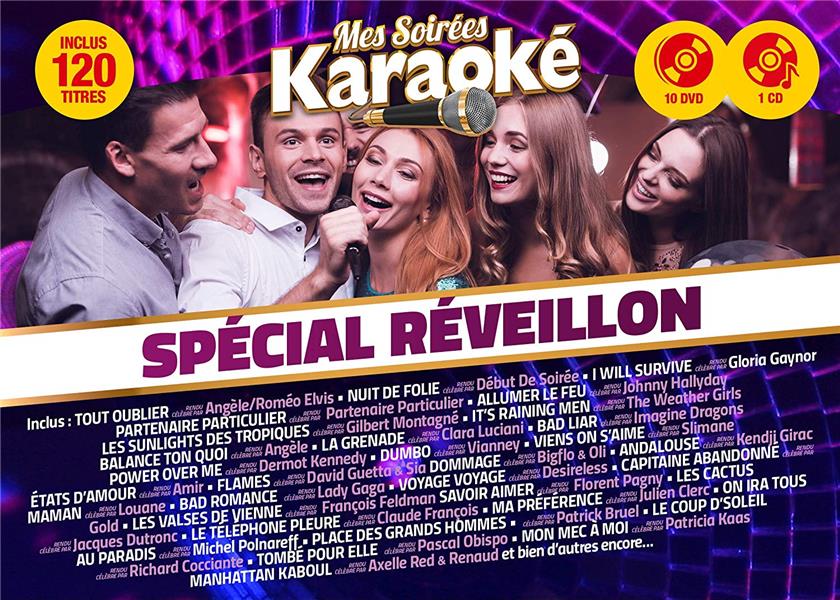 Découvrez le nouveau coffret 10DVD SPÉCIAL RÉVEILLON. Retrouvez 120 HITS d'hier et d'aujourd'hui pour tester vos talents de chanteur. Ce coffret Karaoké c'est l'assurance de passer une soirée conviviale en famille ou entre amis. Devenez la star d'un soir ! .