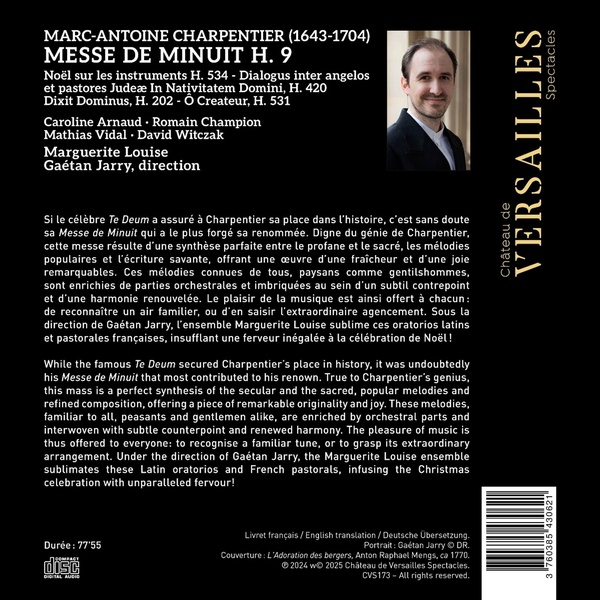 Si le célèbre Te Deum a assuré à Charpentier sa place dans l'histoire, c'est sans doute sa Messe de Minuit qui a le plus forgé sa renommée. Digne du génie de Charpentier, cette messe résulte d'une synthèse parfaite entre le profane et le sacré, les mélodies populaires et l'écriture savante, offrant une oeuvre d''une fraîcheur et d'une joie remarquables. Ces mélodies connues de tous, paysans comme gentilshommes, sont enrichies de parties orchestrales et imbriquées au sein d'un subtil contrepoint et d'une harmonie renouvelée. Le plaisir de la musique est ainsi offert à chacun : de reconnaître un air familier, ou d'en saisir l'extraordinaire agencement. Sous la direction de Gaétan Jarry, l'ensemble Marguerite Louise sublime ces oratorios latins et pastorales françaises, insufflant une ferveur inégalée à la célébration de Noël !