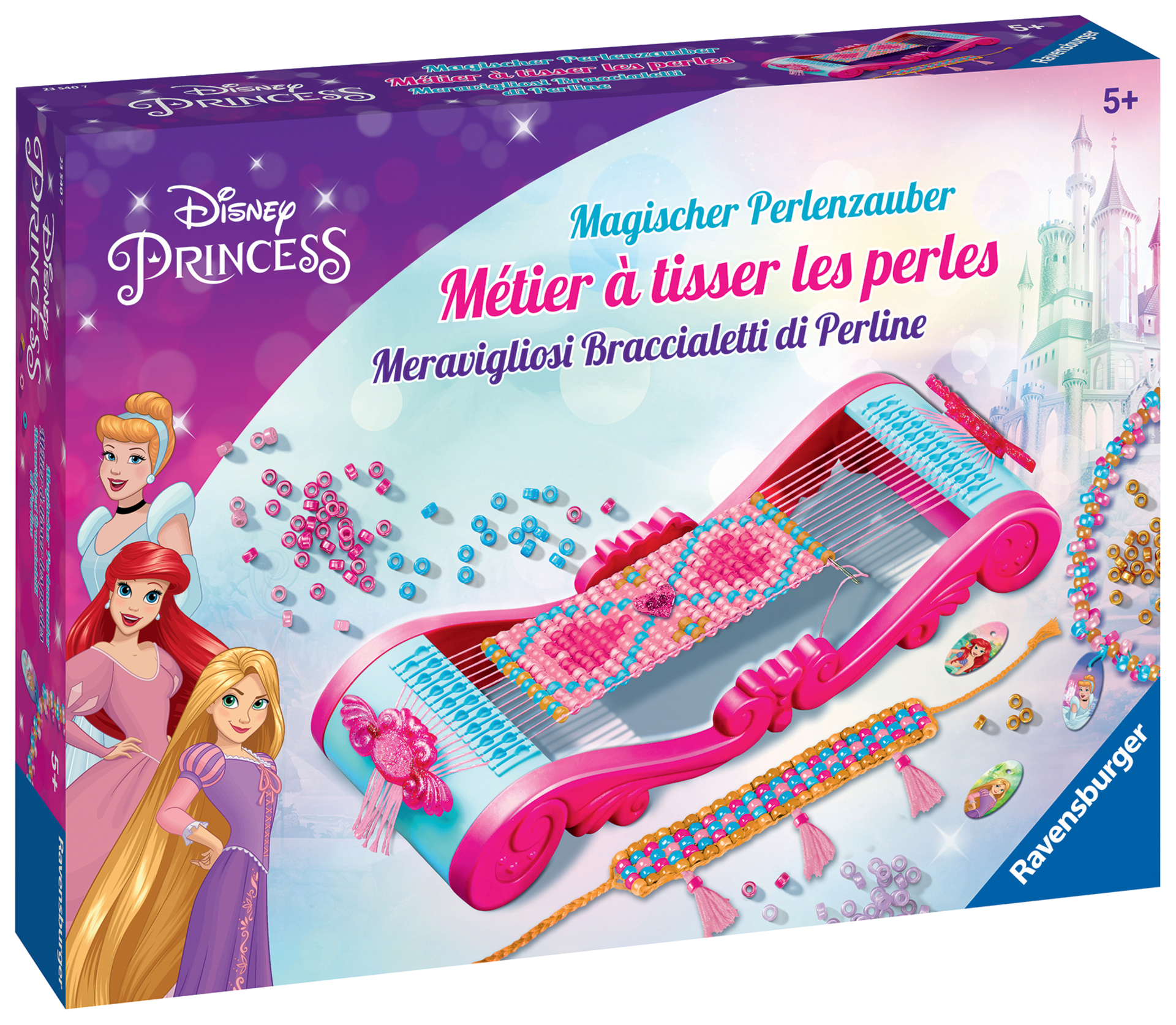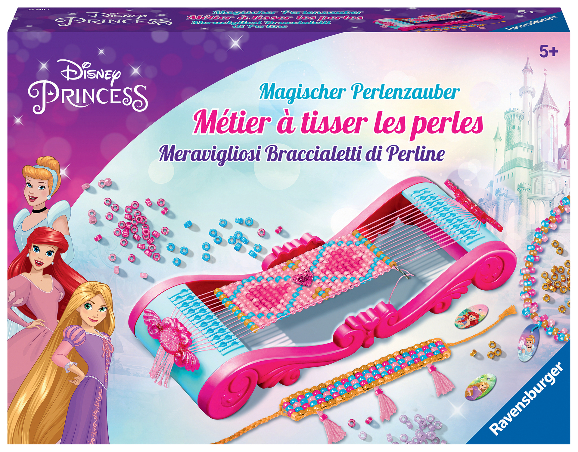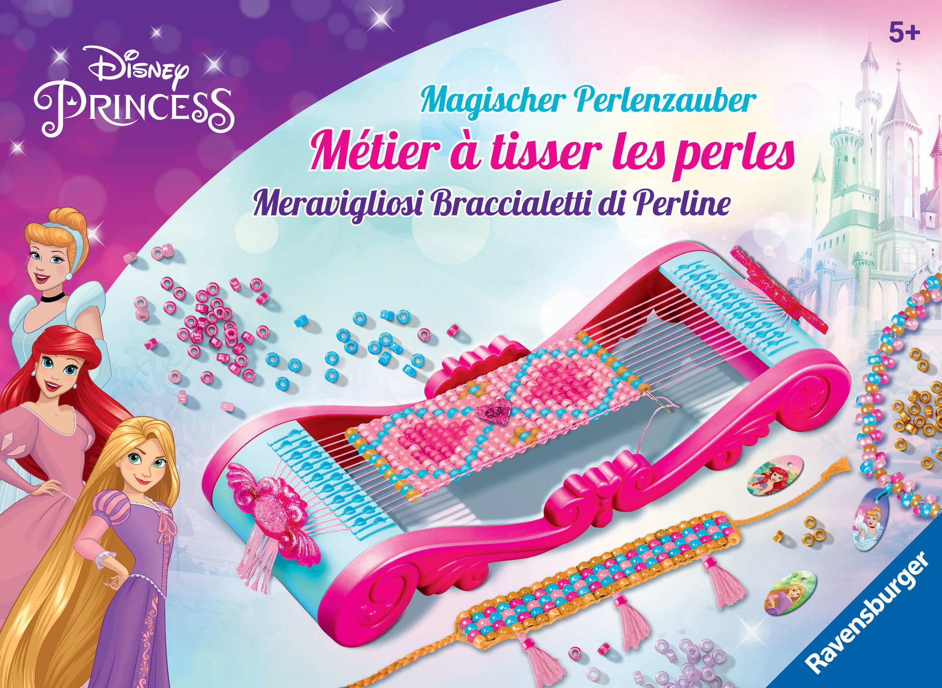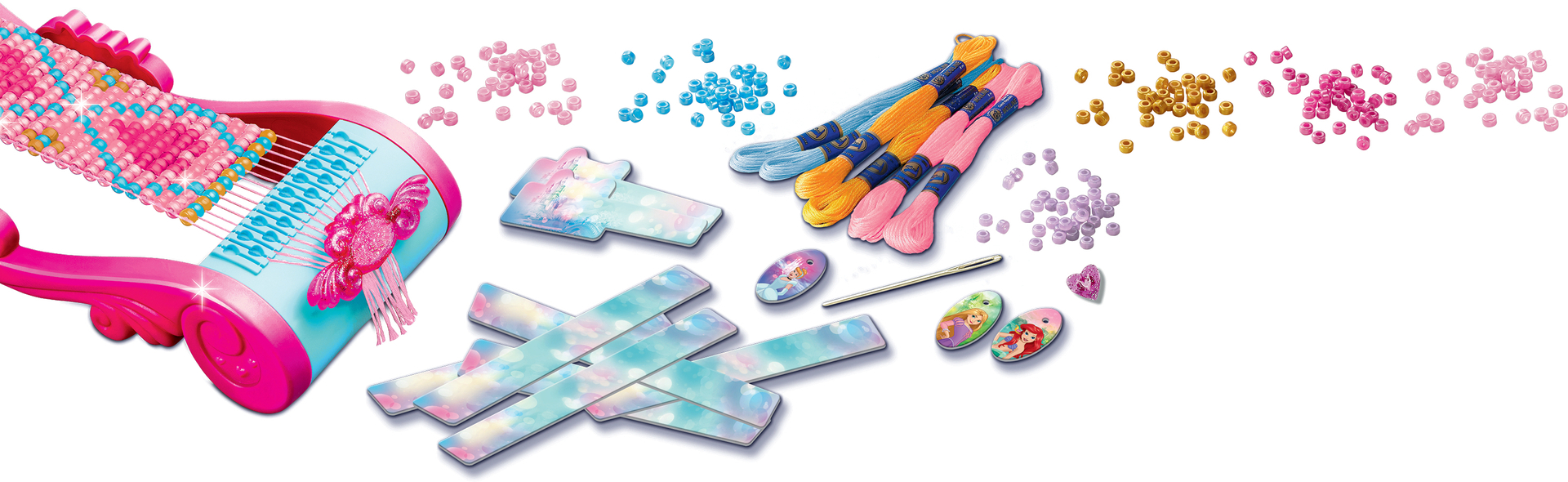 | Plus produit | CRÉE TA COLLECTION DE BRACELETS EN PERLES Enfile de superbes perles et crée tes bracelets digne d\'une princesse Disney grâce au métier à tisser. Une fois tes bracelets finis, personnalise-les avec les médaillons inclus avec Cendrillon, Ariel et Raiponce. Dès 5 ans. ADAPTÉ AUX ENFANTS À PARTIR DE 5 ANS Grâce aux 1250 grosses perles satinées, au métier à tisser avec bandes de fixation, à l\'aiguille en plastique et à la notice explicative avec plusieurs modèles de bracelets, le contenu est adapté aux petites mains des enfants. UN MÉTIER A TISSER PRATIQUE Ton métier à tisser les perles rose est décoré par des parures de princesse. Les bandes de fixation incluses permettent d\'assurer une stabilité dans la réalisation des bracelets. Utilisable sans piles et simple. FAVORISE CONCENTRATION ET AUTONOMIE Loin des écrans, cette activité créative allie dextérité et précision pour développer l\'habilité manuelle des enfants. Une fois finis, porte tes bracelets ou offre-les à tes proches. TOUT EST INCLUS 1 grand métier à tisser solide, 1250 grosses perles, 6 médaillons, 6 fils de trois couleurs différentes, 1 outil pour créer des pompons plats, 1 aiguille à pointe arrondie, 6 bandes de fixation et 1 livret explicatif complet |