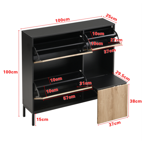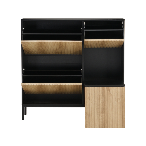 Ce meuble à chaussures élégant allie fonctionnalité et élégance, offrant une solution de rangement astucieuse et pratique pour votre maison. L'armoire est astucieusement divisée et comprend deux étagères, un tabouret à langer et un compartiment inférieur ouvert pouvant accueillir 12 personnes, soit 16 paires de chaussures de différentes tailles. Le grand compartiment est adapté aux chaussures pour hommes, tandis que le plus petit est réservé aux chaussures pour femmes et enfants. L'espace ouvert est un espace pratique pour les pantoufles, répondant aux besoins de chaque membre de la famille. Son atout majeur est le banc coulissant dissimulé, permettant d'enfiler et de retirer ses chaussures facilement. Ce meuble gain de place s'intègre parfaitement à votre armoire et offre une fonctionnalité supplémentaire sans occuper plus d'espace. L'esthétique de ce meuble réside dans le motif ondulé unique en relief des portes, qui ajoute texture et profondeur et crée un magnifique jeu d'ombres et de lumière. Le noir du meuble s'harmonise avec les tons naturels du bois, ce qui en fait un produit polyvalent qui embellira toute entrée, couloir ou chambre. Cette armoire est non seulement durable, mais elle respire également l'élégance intemporelle tout en servant d'unité de rangement pratique et peut également être utilisée comme objet personnalisé dans la maison.