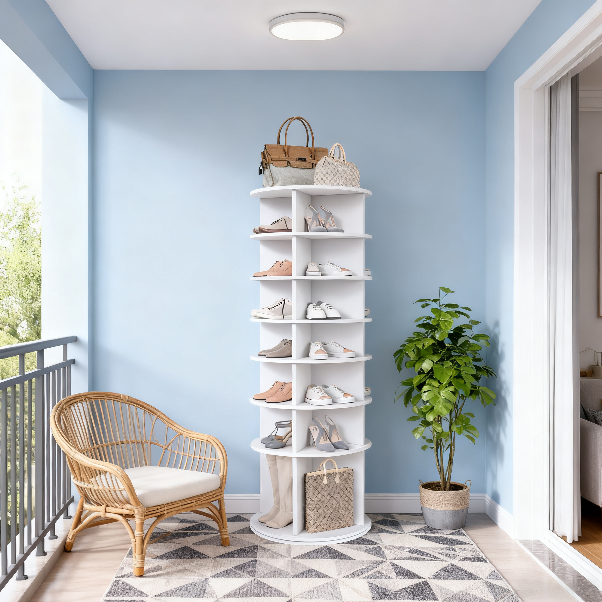 Grâce à sa rotation à 360° et à sa conception autoportante, vous visualisez toutes vos chaussures en un clin d'œil. Accédez-y facilement de n'importe quel côté – parfait pour les placards ou les couloirs encombrés.