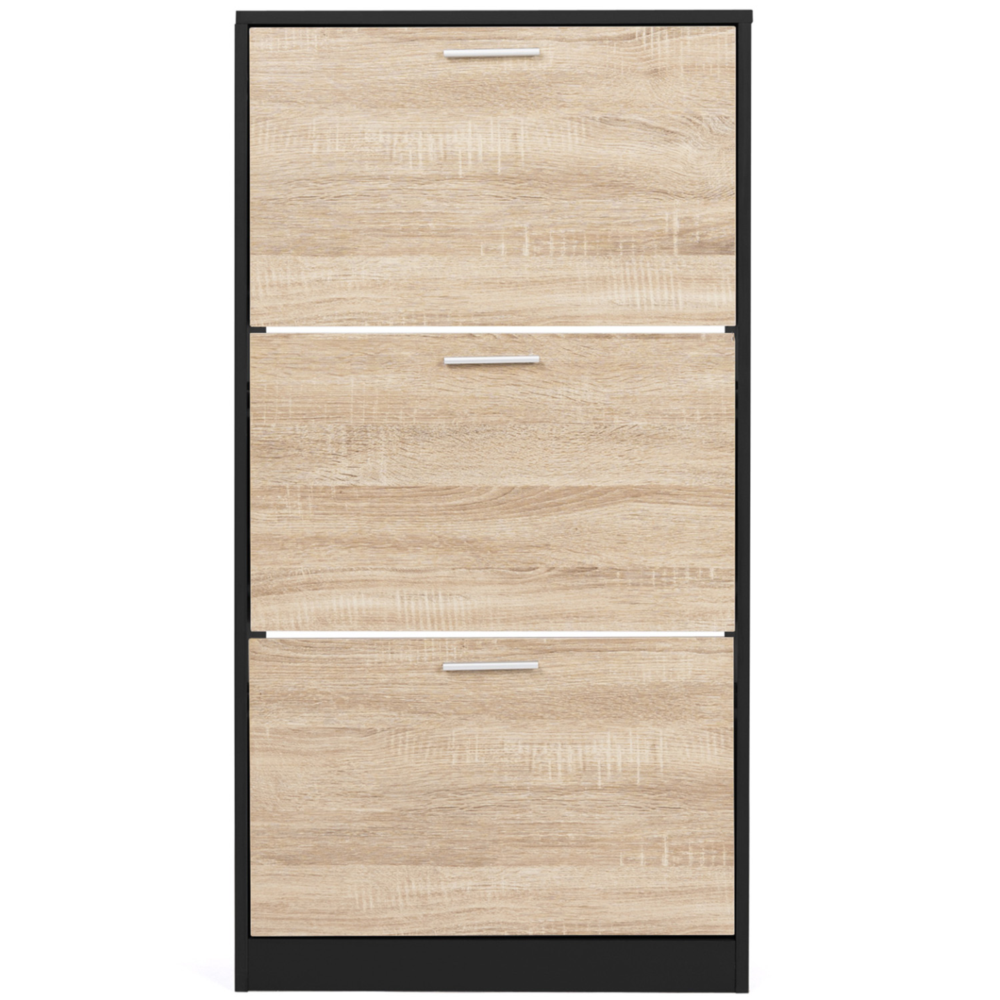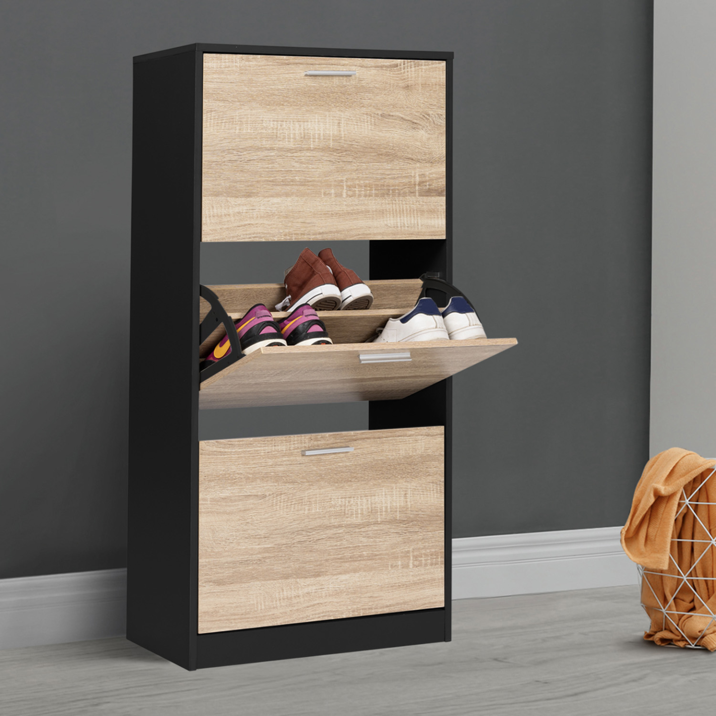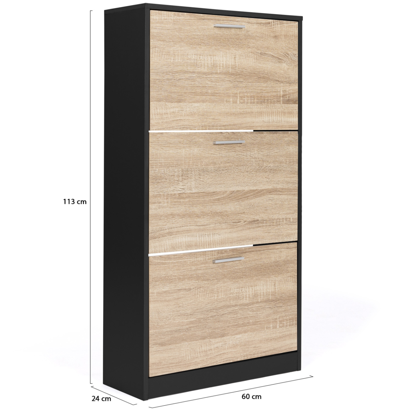 Avec sa capacité de 18 paires de chaussures, toute la famille trouvera une place pour garder ses chaussures à l'abri de la poussière dans ce meuble compact !Derrière chacune des 3 portes de ce meuble d'entrée, l'espace de rangement est compartimenté à l'aide d'une cloison intermédiaire, permettant ainsi de disposer jusqu'à 6 paires de chaussures par niveau (soit une capacité de 18 paires au total) ! Chaque membre de la famille aura ainsi droit à son espace dédié !Ultra plat, avec sa profondeur de 24 cm et son design tout en hauteur, il n'encombrera pas votre pièce ! Le format abattant des portes, gain de place et astucieux, associé aux poignées pratiques, permet une ouverture facile. Idéal dans une entrée, un couloir, un dressing ou une buanderie !Il s'adaptera parfaitement à votre intérieur et habillera tous types de couloir ou d'entrée grâce à son design fonctionnel, chic et moderne ! Bicolore imitation hêtre et noir, les coloris tendances de ce meuble à chaussures feront de votre vestibule un espace accueillant et bien rangé !La structure en panneaux de particules de bois (épaisseur 1,5 cm) de cette étagère à chaussures lui garantit stabilité et robustesse.Ne laissez plus traîner vos paires de chaussures et gardez-les à l'abri des regards dans ce meuble de rangement moderne et discret !Dimensions du meuble à chaussures noir et 3 portes imitation hêtre Dimensions globales : Longueur 60 cm x largueur 24 cm x Hauteur 113 cmDimensions de l'espace de rangement : L. 56,5 x l. 24 x H. 34,5 cmMatériaux : Panneaux de particules de bois 1,5 cm / 1,2 cmCapacité : 18 paires de chaussuresÀ fixer au mur pour éviter tout risque de basculementÀ monter soi-mêmeRetrouvez l'intégralité de nos meubles à chaussures ainsi que nos vestiaires et meubles d'entrée sur notre boutique en ligne !