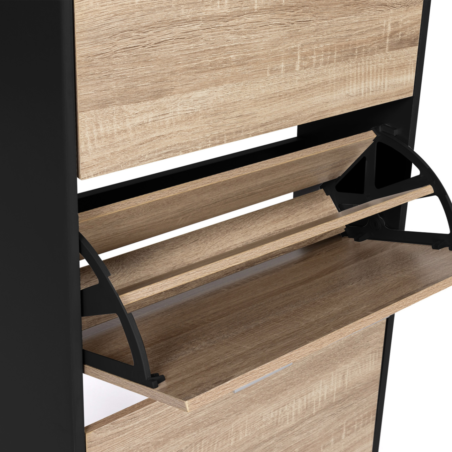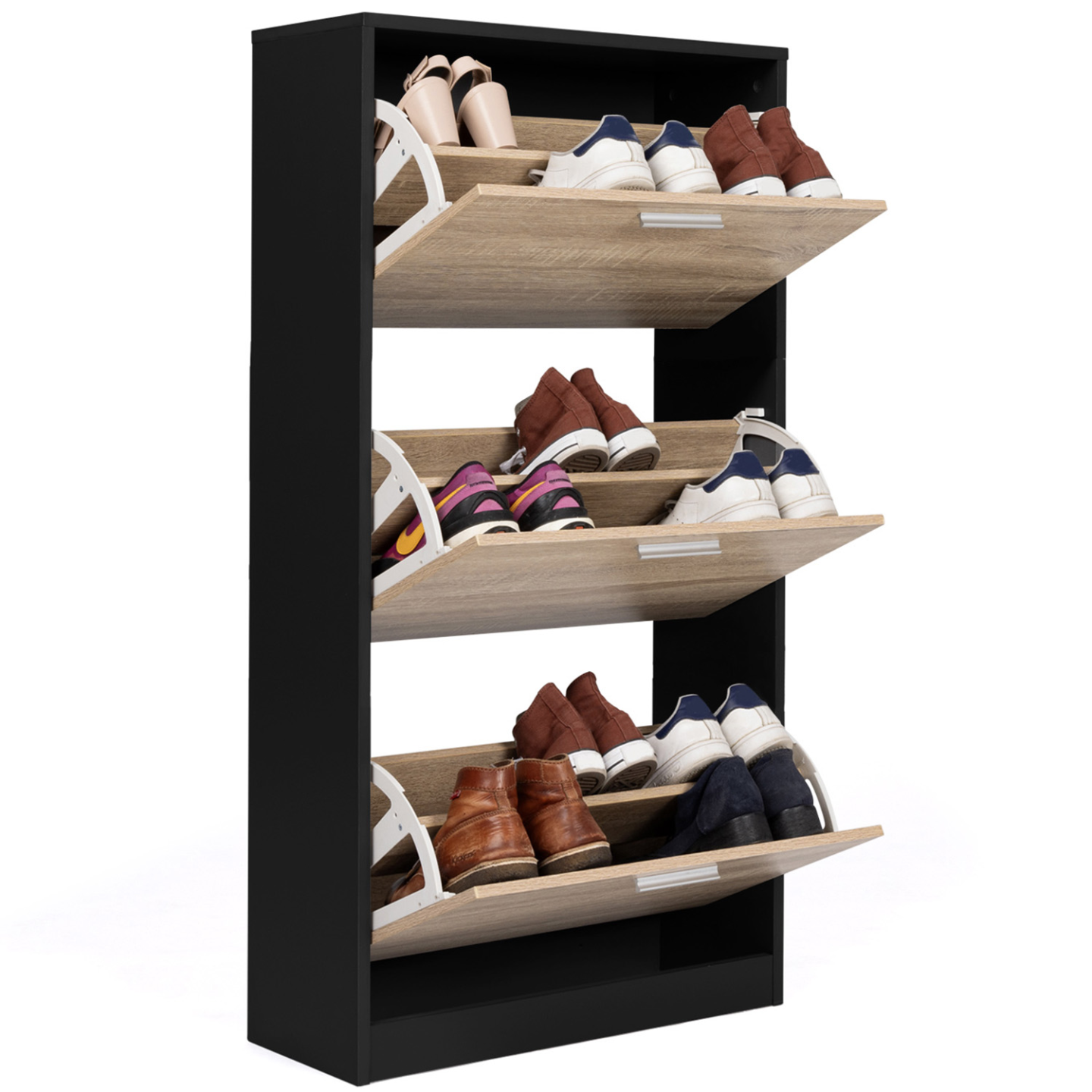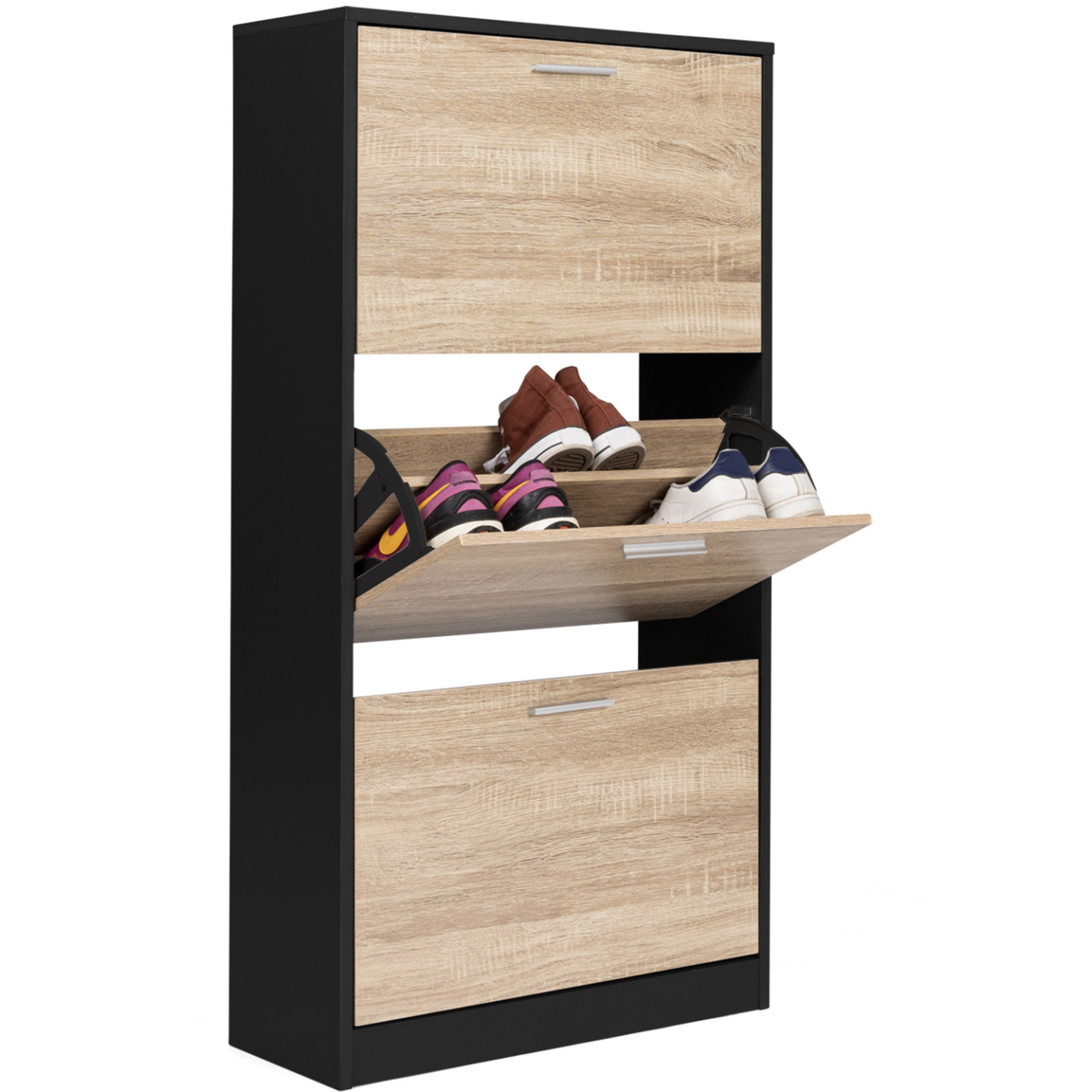 Avec sa capacité de 18 paires de chaussures, toute la famille trouvera une place pour garder ses chaussures à l'abri de la poussière dans ce meuble compact !Derrière chacune des 3 portes de ce meuble d'entrée, l'espace de rangement est compartimenté à l'aide d'une cloison intermédiaire, permettant ainsi de disposer jusqu'à 6 paires de chaussures par niveau (soit une capacité de 18 paires au total) ! Chaque membre de la famille aura ainsi droit à son espace dédié !Ultra plat, avec sa profondeur de 24 cm et son design tout en hauteur, il n'encombrera pas votre pièce ! Le format abattant des portes, gain de place et astucieux, associé aux poignées pratiques, permet une ouverture facile. Idéal dans une entrée, un couloir, un dressing ou une buanderie !Il s'adaptera parfaitement à votre intérieur et habillera tous types de couloir ou d'entrée grâce à son design fonctionnel, chic et moderne ! Bicolore imitation hêtre et noir, les coloris tendances de ce meuble à chaussures feront de votre vestibule un espace accueillant et bien rangé !La structure en panneaux de particules de bois (épaisseur 1,5 cm) de cette étagère à chaussures lui garantit stabilité et robustesse.Ne laissez plus traîner vos paires de chaussures et gardez-les à l'abri des regards dans ce meuble de rangement moderne et discret !Dimensions du meuble à chaussures noir et 3 portes imitation hêtre Dimensions globales : Longueur 60 cm x largueur 24 cm x Hauteur 113 cmDimensions de l'espace de rangement : L. 56,5 x l. 24 x H. 34,5 cmMatériaux : Panneaux de particules de bois 1,5 cm / 1,2 cmCapacité : 18 paires de chaussuresÀ fixer au mur pour éviter tout risque de basculementÀ monter soi-mêmeRetrouvez l'intégralité de nos meubles à chaussures ainsi que nos vestiaires et meubles d'entrée sur notre boutique en ligne !