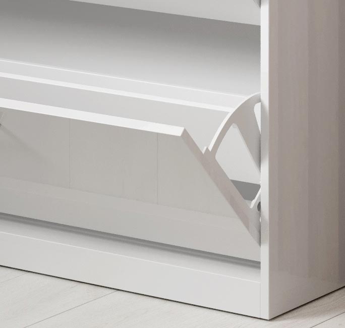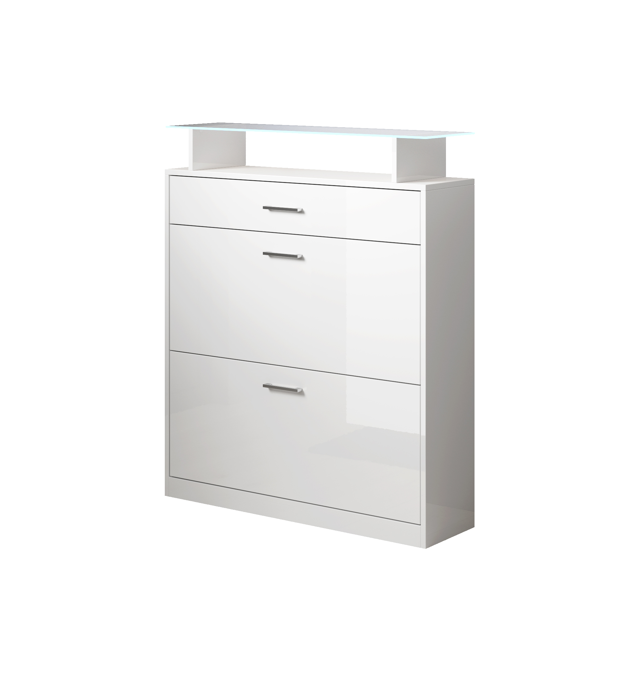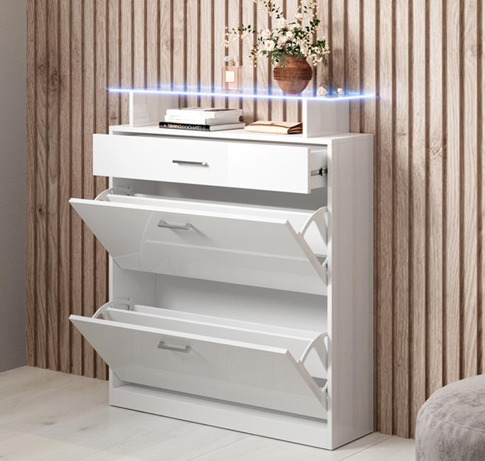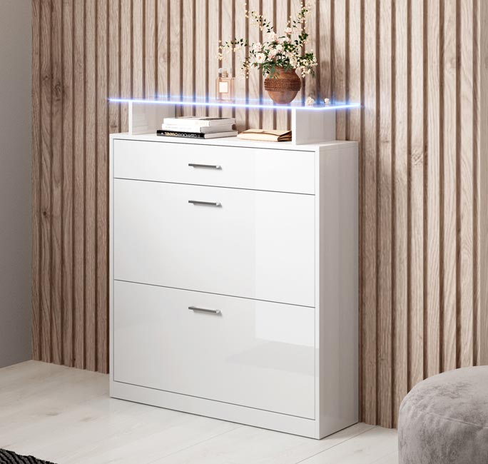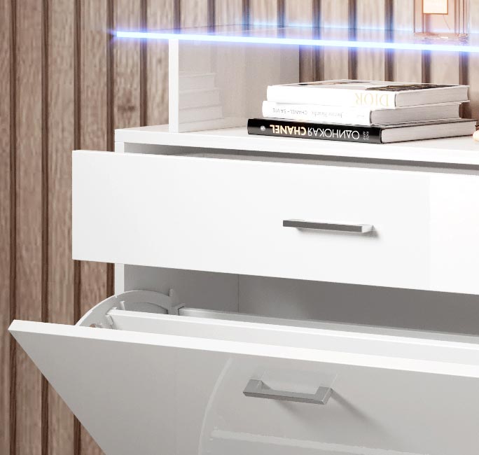 | Libellé | Meuble à Chaussures LED | 105 x 89 x 24cm | Blanc Finition brillante | Meuble d'entrée | 2 portes 1 tiroir | Modèle PAOLA |