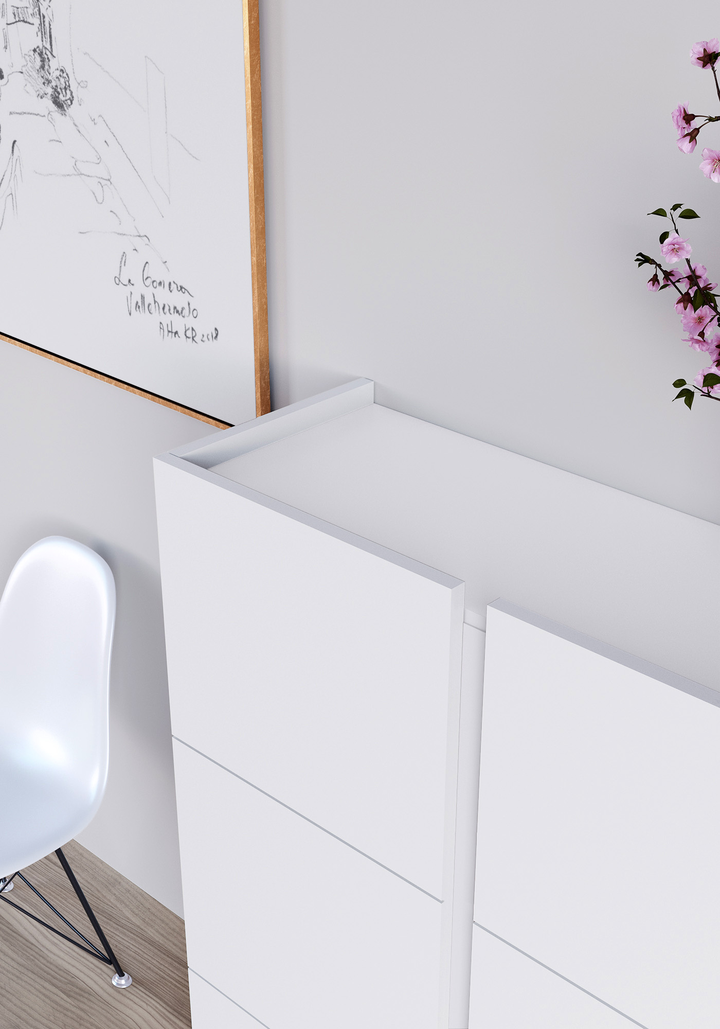 Meuble à chaussures en mélamine dans un style scandinave. Les deux portes sont légèrement plus hautes pour faciliter l’ouverture. Son design simple et multifonctionnel permmet de l'utiliser aussi comme meuble de rangement à l'entrée, la chambre, le vestiaire, la salle de jeux, etc.