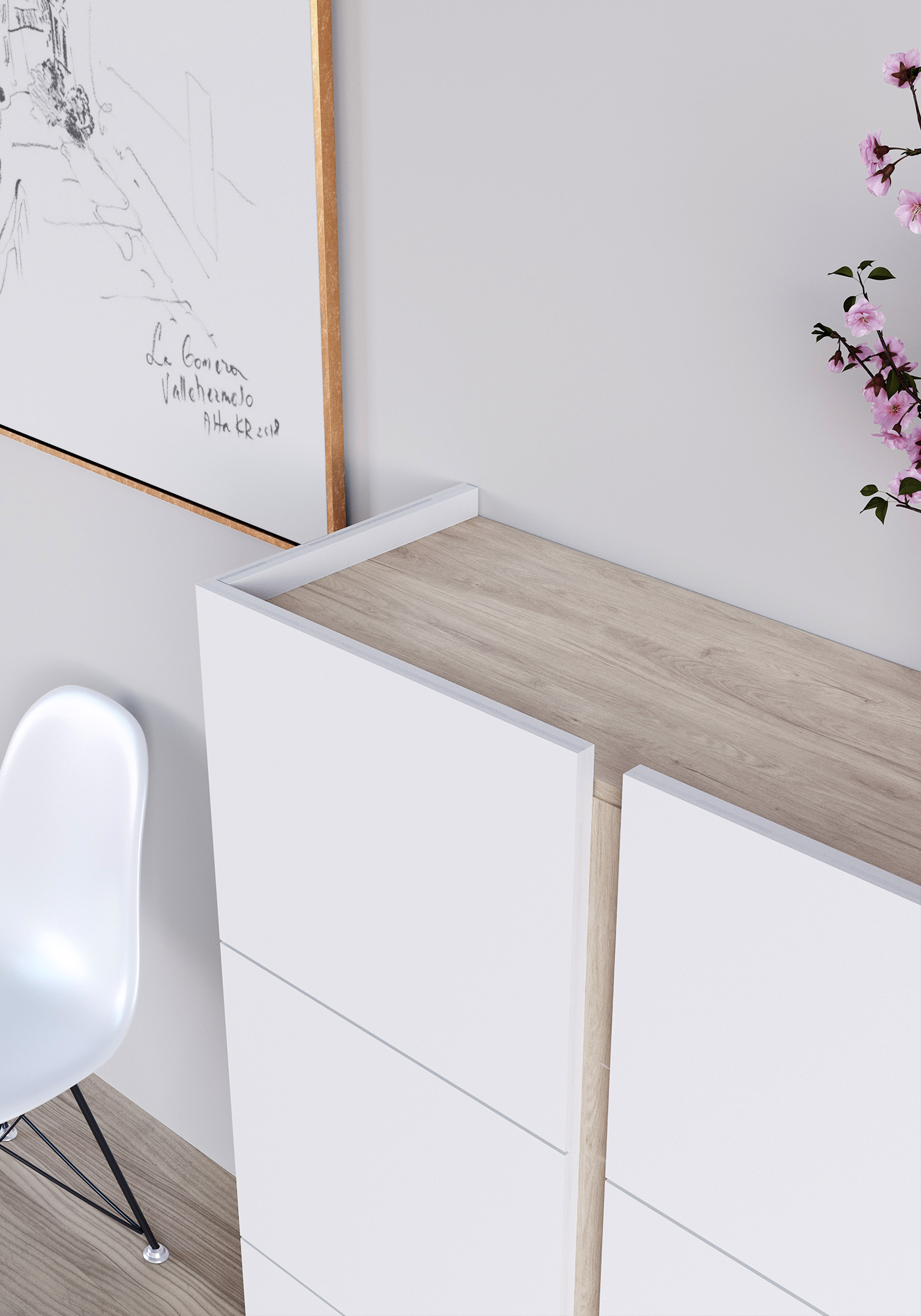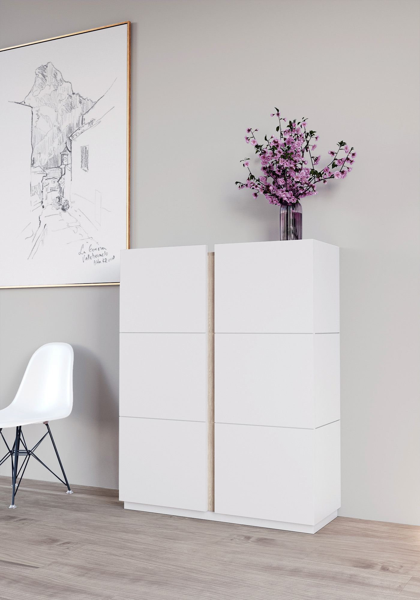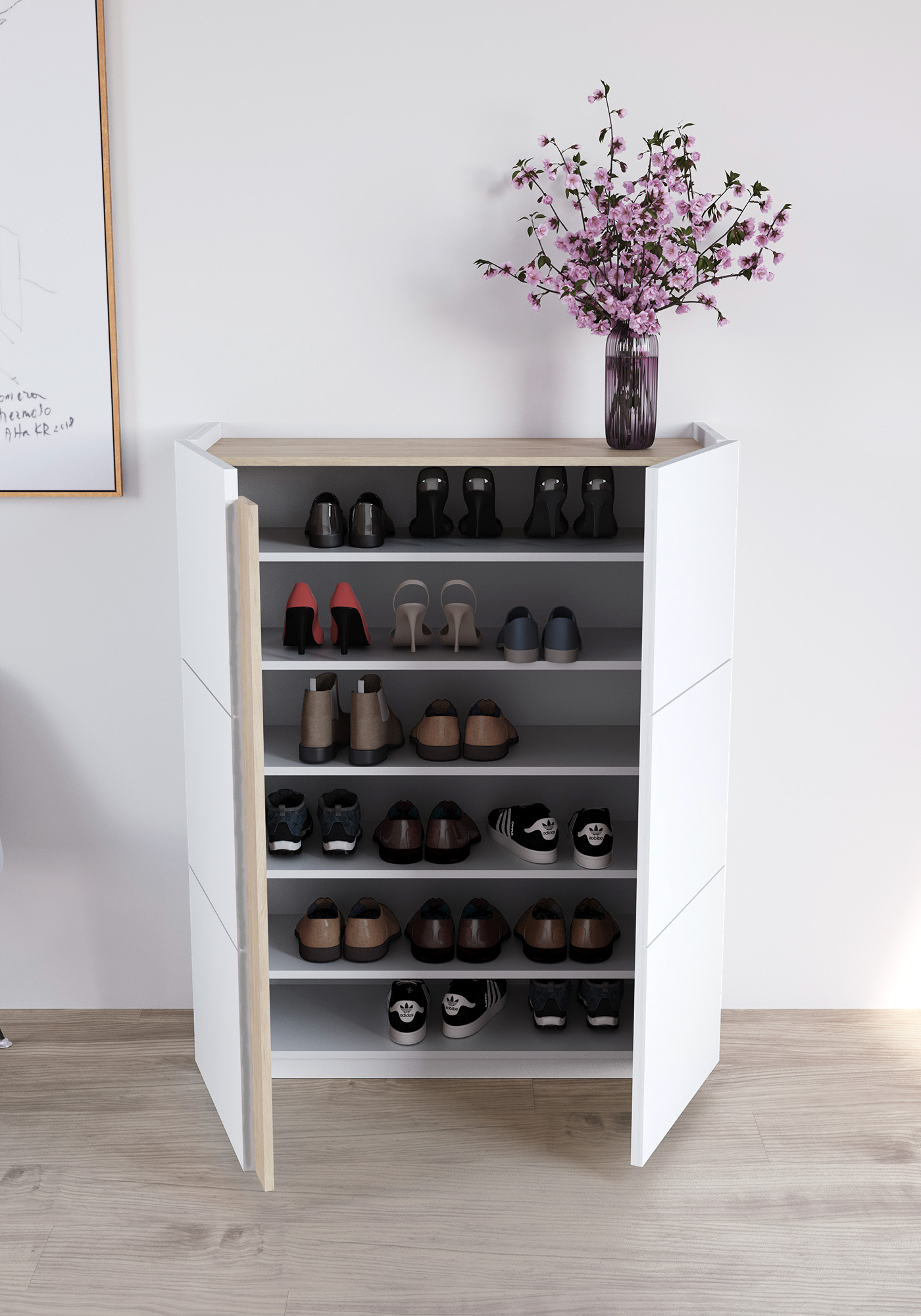 Meuble à chaussures en mélamine dans un style scandinave. Les deux portes sont légèrement plus hautes pour faciliter l’ouverture. Son design simple et multifonctionnel permmet de l'utiliser aussi comme meuble de rangement à l'entrée, la chambre, le vestiaire, la salle de jeux, etc.