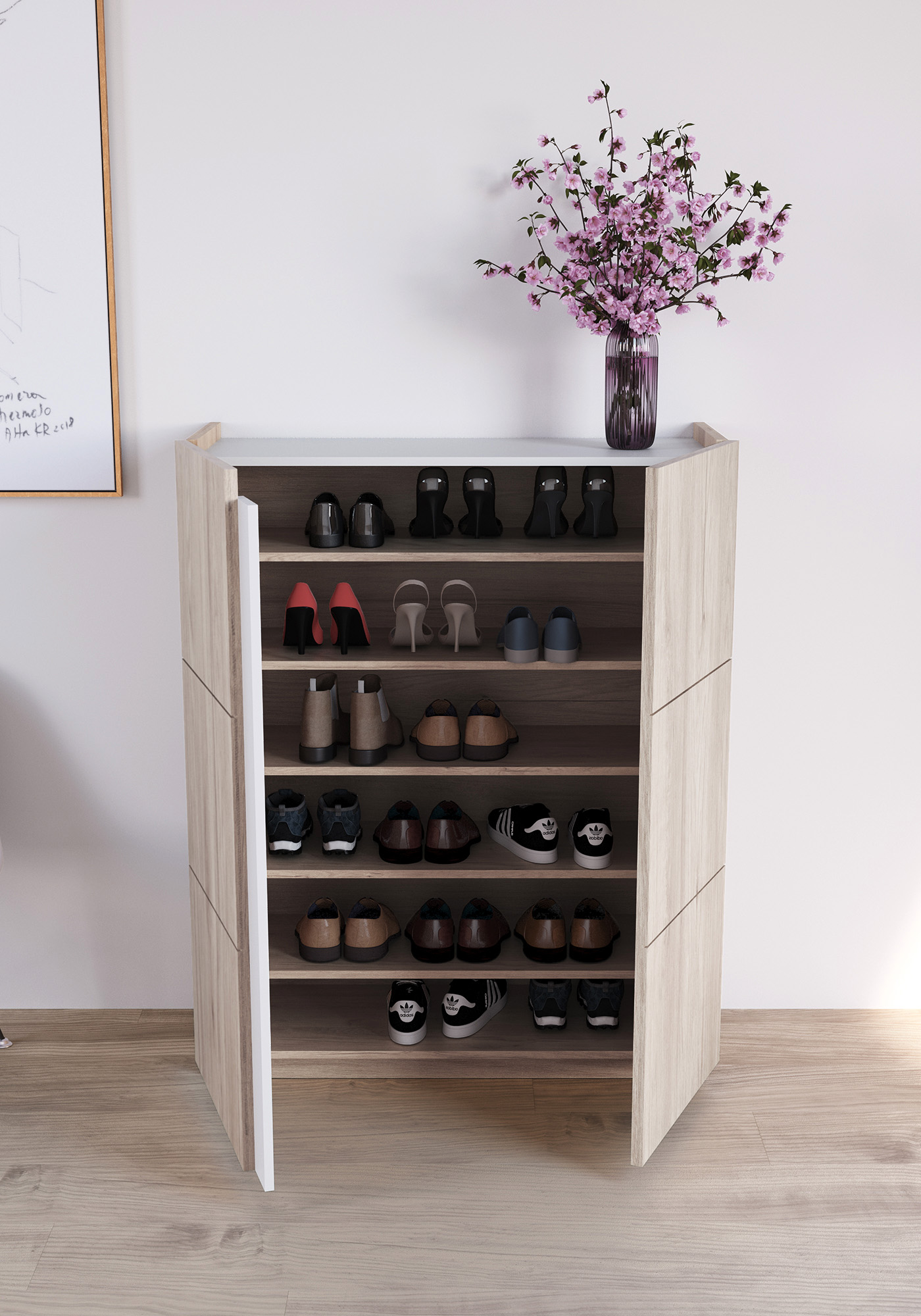 Meuble à chaussures en mélamine dans un style scandinave. Les deux portes sont légèrement plus hautes pour faciliter l’ouverture. Son design simple et multifonctionnel permmet de l'utiliser aussi comme meuble de rangement à l'entrée, la chambre, le vestiaire, la salle de jeux, etc.