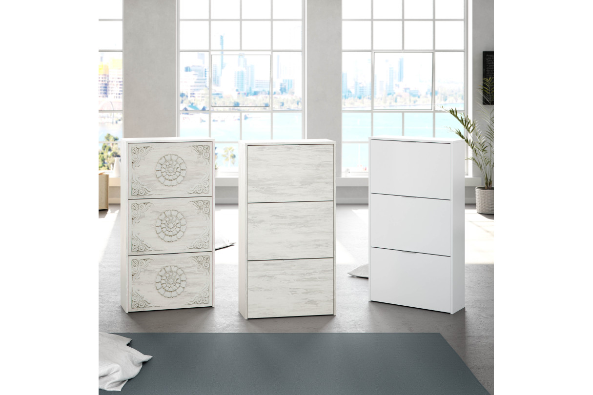 Marre de voir des chaussures trainer chez vous ? On a la solution pour vous ! Notre meuble à chaussures NOLAN doté de ses 3 portes abattantes vous facilitera la vie ! Grâce à sa capacité de stockage, il vous permettra de ranger plus de 18 paires de chaussures.