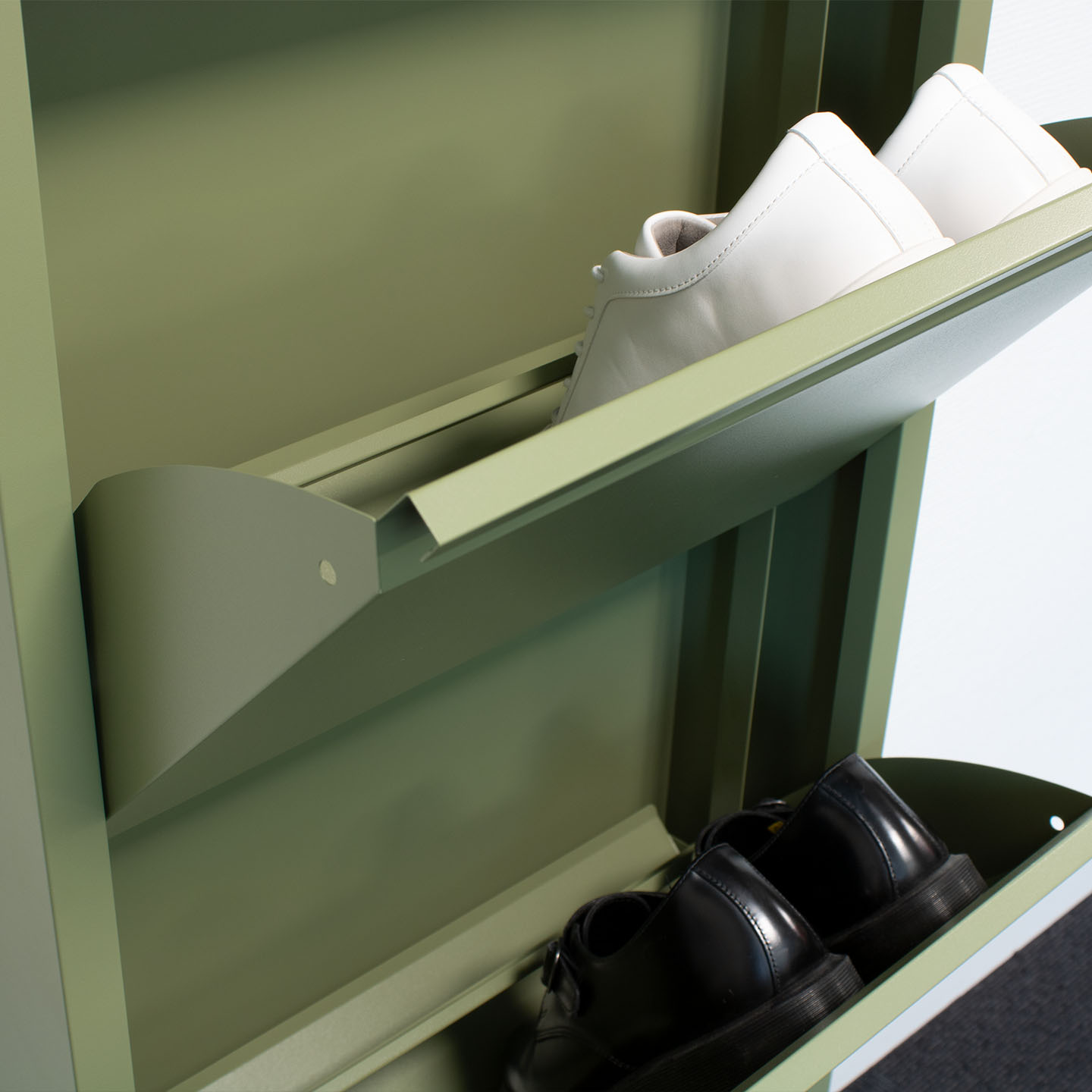 Meuble à chaussures Pisa avec 3 portes en métal vert. Livré entièrement assemblé, un meuble à chaussures de couleur verte, qui apporte à la fois style et fonctionnalité à votre maison. Livré entièrement assemblé. Vert Ral 6013. Tiroir intérieur : L46/L29/P13 cm. Peut être posé au sol ou accroché au mur. Peut être utilisé individuellement. Les portes s'ouvrent simultanément. Ce produit est créé avec un souci du détail, ce qui garantit à la fois un attrait esthétique et une grande durabilité. Il est conçu dans un souci à la fois de fonctionnalité et de style, ce qui en fait le choix parfait pour n’importe quelle pièce de votre maison. Les matériaux utilisés sont de haute qualité, ce qui confère au produit une longue durée de vie et lui permet de résister à une utilisation quotidienne. Que ce soit pour le rangement ou comme ajout décoratif, ce produit rehaussera votre décor et apportera plus de confort et d'élégance à votre maison.