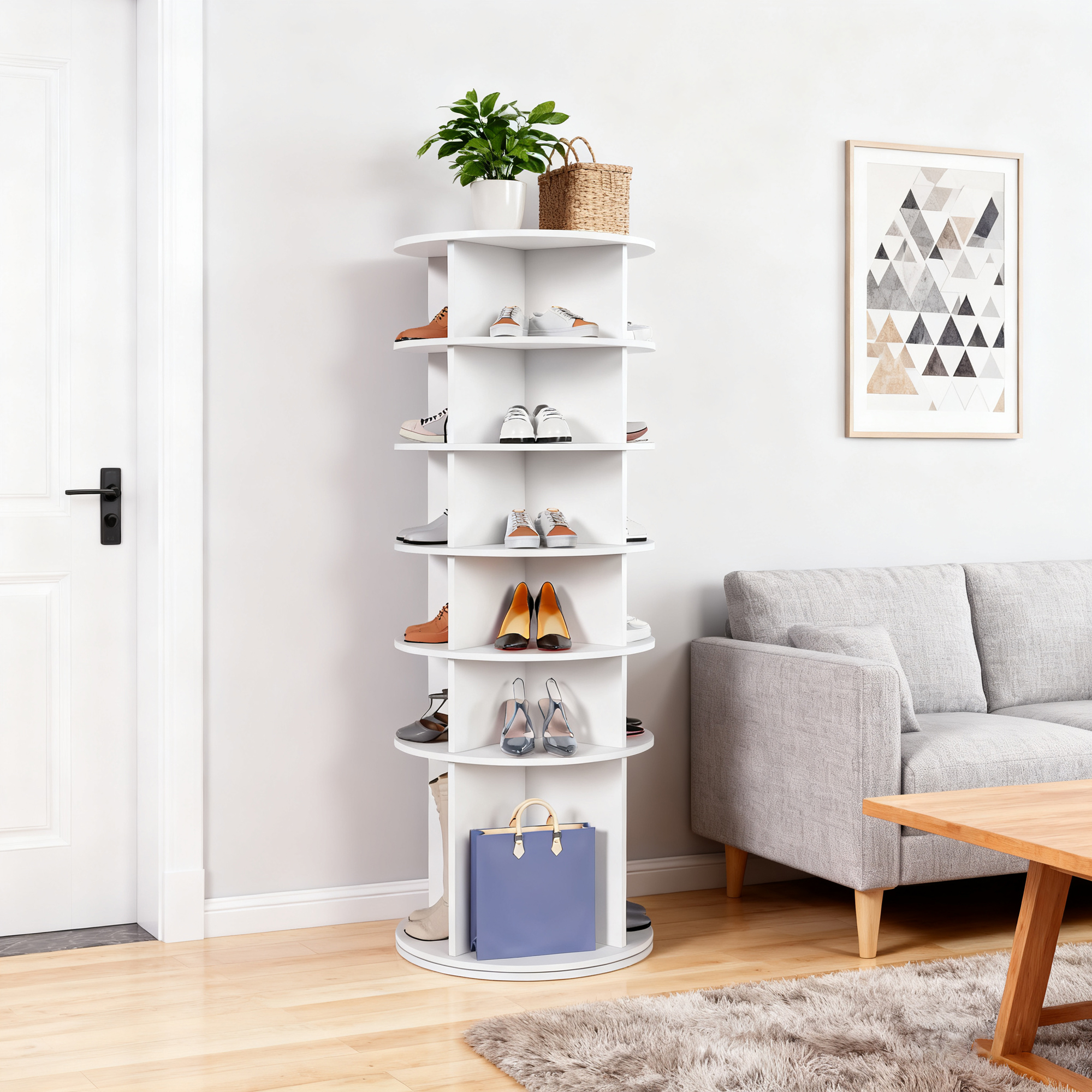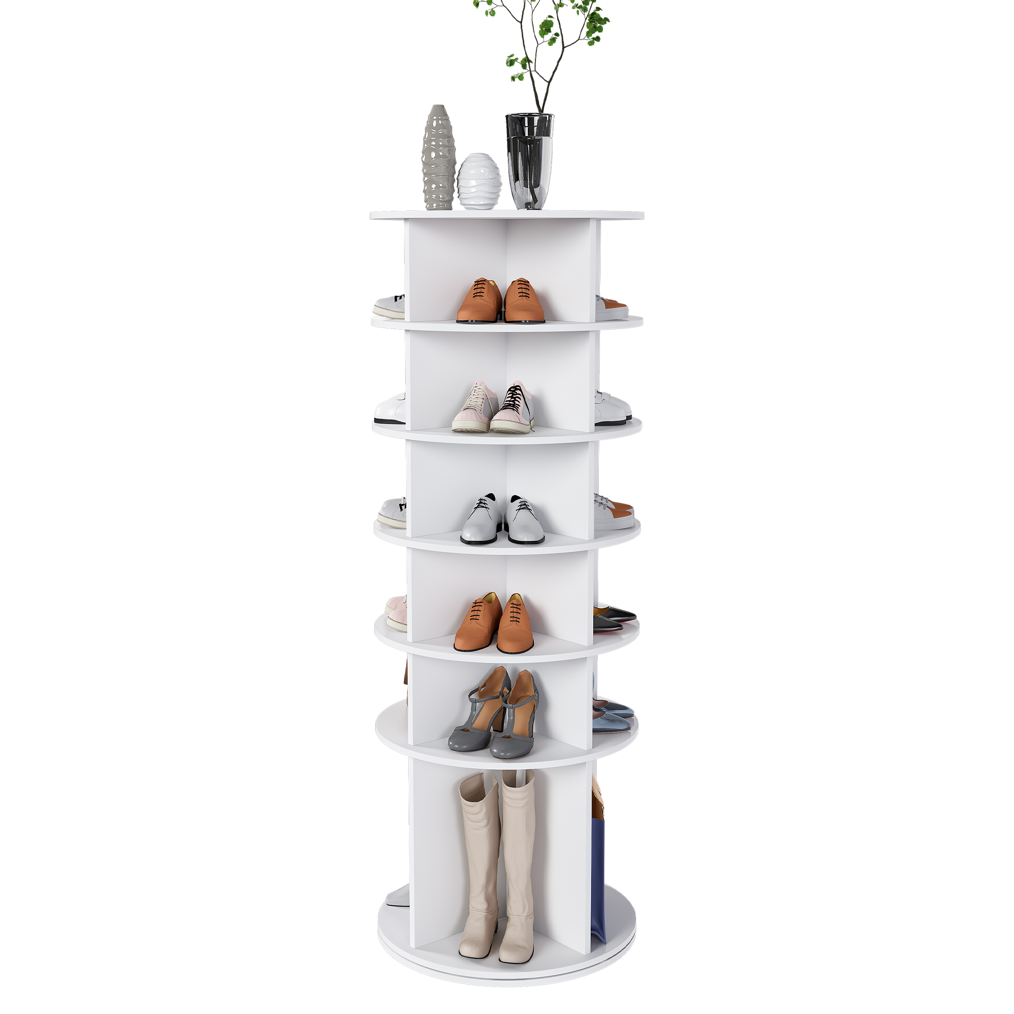 Cette tour à chaussures rotative à 6 niveaux peut accueillir jusqu'à 24 paires de chaussures ou accessoires. Grâce à sa conception compacte (60 cm de large x 60 cm de profondeur), elle optimise l'espace dans votre dressing ou votre entrée et vous permet de garder votre maison bien rangée.