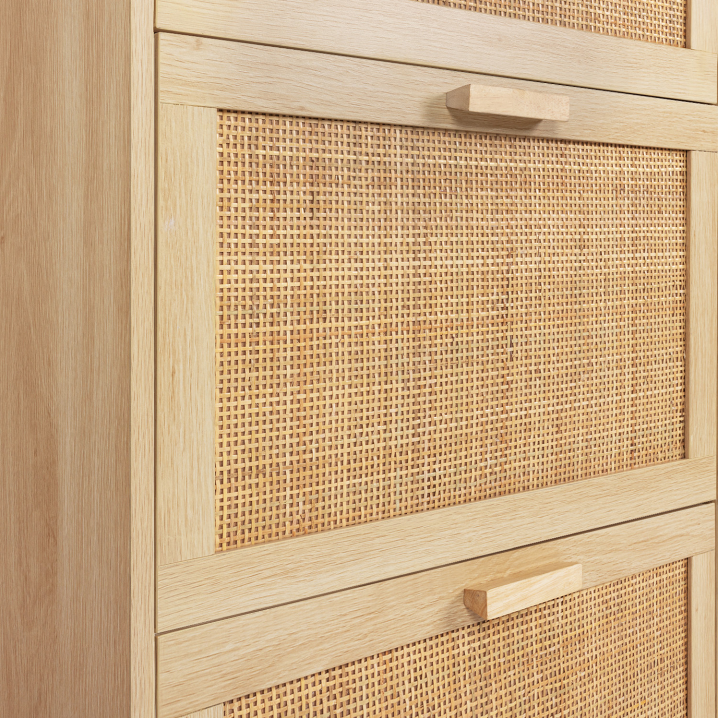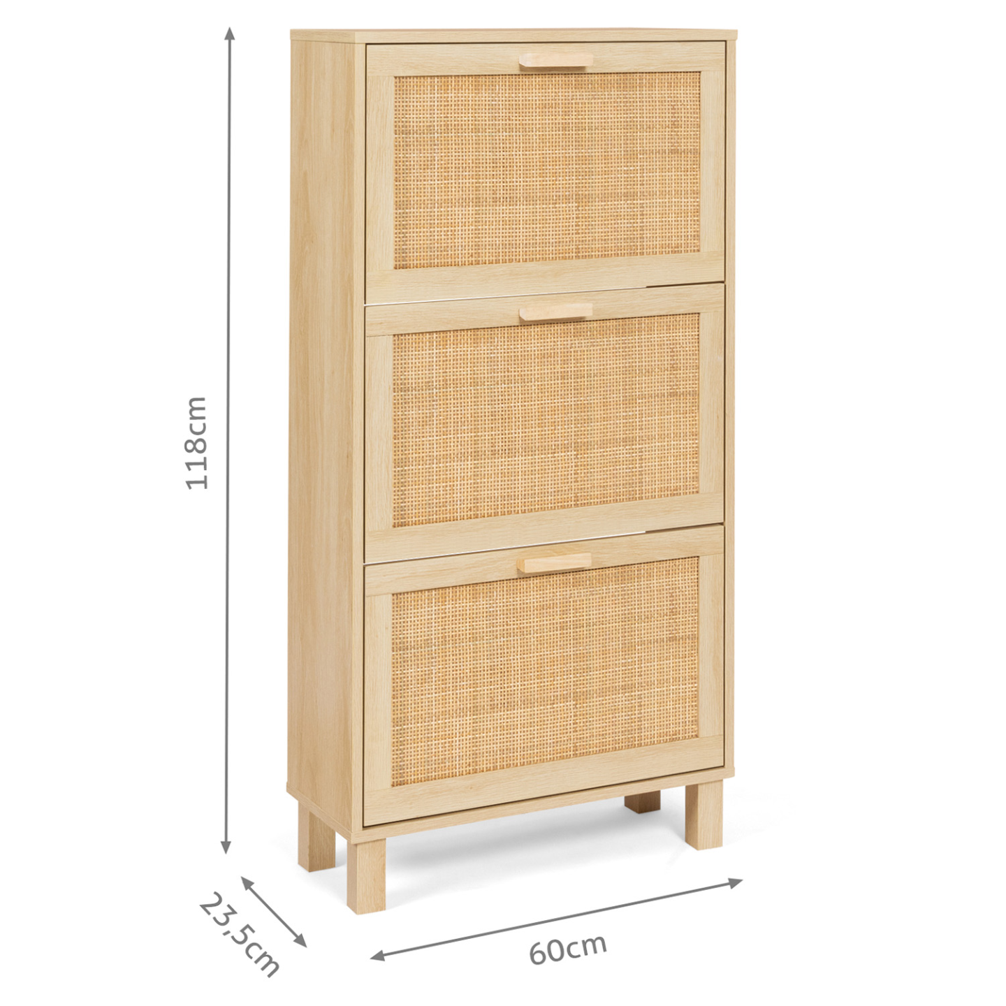 Créez un espace de rangement moderne et fonctionnel pour toutes vos paires de chaussures grâce au meuble à chaussures 3 portes ELIN ! Fini les chaussures qui trainent ! Avec sa capacité de 18 paires (6 paires par compartiment), toute la famille trouvera désormais une place pour ranger ses chaussures à l'abri des regards et de la poussière pour un espace toujours ordonné !Chaque compartiment est séparé intérieurement par une cloison intermédiaire pour organiser votre dressing à chaussures.Le format abattant des portes, gain de place et astucieux, permet une ouverture facile et rapide ! Les jolies poignées ainsi que le mélange du bois et du cannage apportent une touche tendance et naturelle, pour un intérieur chaleureux.Les finitions soignées du meule à chaussures ELIN vous donnent la possibilité de l'installer aussi bien dans une buanderie, un dressing, ou même une entrée !Vous n'avez plus qu'à poser de jolis objets décoratifs ou de petites plantes vertes sur le dessus du meuble et le tour et joué !Ultra plat, avec sa profondeur de 23,5 cm et son design tout en hauteur, il vous fera gagner de la place et n'encombrera pas votre pièce ! Son format légèrement surélevé est idéal pour nettoyer sous le dessous du meuble.Ne laissez plus traîner vos paires de chaussures et gardez-les à l'abri des regards dans ce meuble de rangement moderne et discret !A fixer au mur pour éviter tout risque de basculement.Dimensions du meule à chaussures 3 portes ELIN Dimensions globales : Longueur 60 x largeur 23.50 x Hauteur 118 cm Hauteur des pieds : 10cm Dimensions façade portes : L.34 x H.56 cm Encadrement des portes : 4 cm Longueur poignée : 9 cm 3 portes battantes Matériaux : panneaux de particules 15 mm et 12 mm + cannage naturel + pieds en bois de pin Coloris : bois clair À monter soi-mêmeDécouvrez également l'ensemble de nos meubles à chaussures sur notre boutique en ligne !
