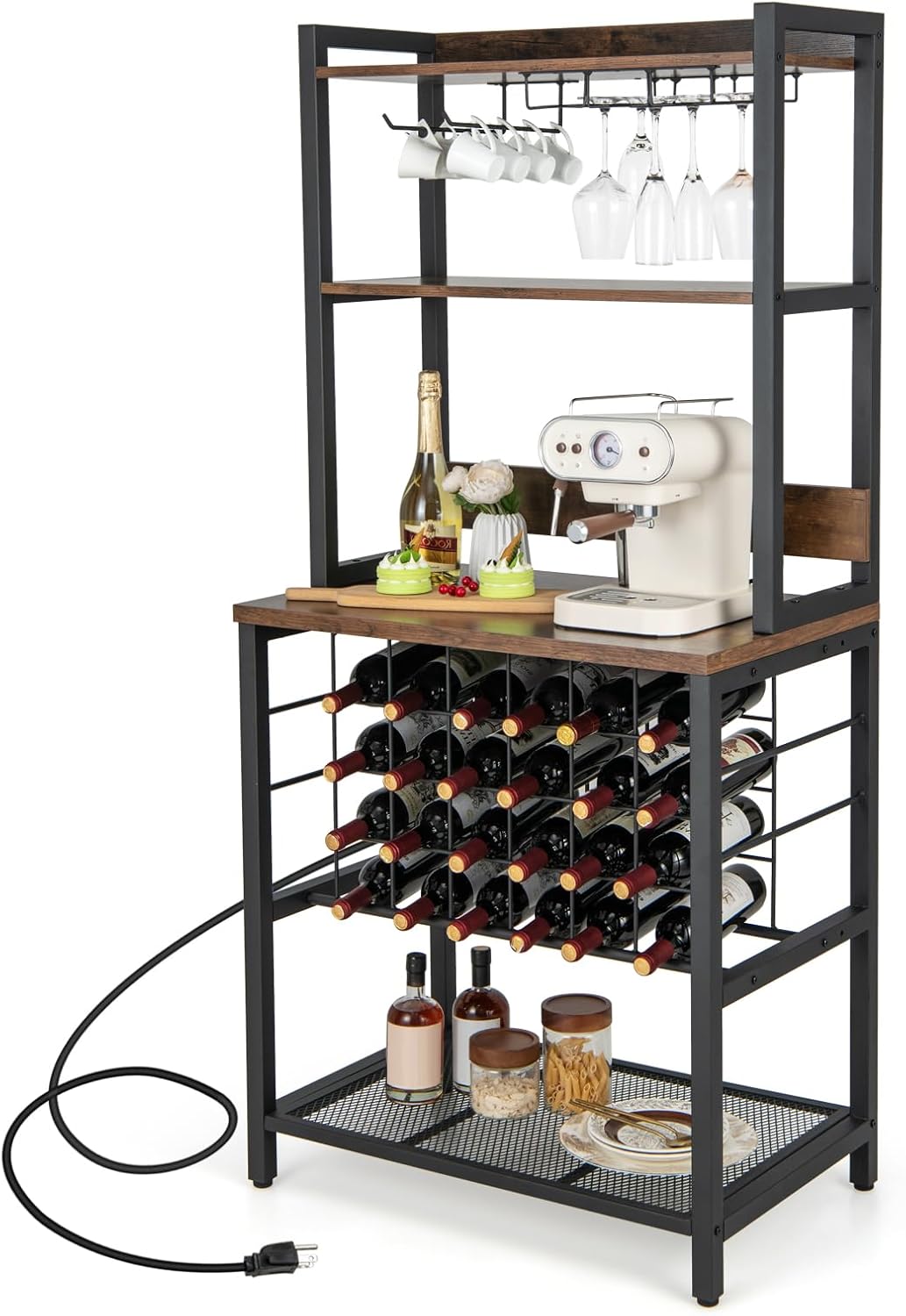 Notre table de casier à vin dispose de 3 étagères de rangement, un large comptoir et plusieurs crochets, vous offrant suffisamment d’espace pour contenir au maximum 9 verres à vin et 24 bouteilles. Les prises de courant équipées facilitent la recharge des appareils électroniques, et les bords surélevés de l’étagère supérieure empêchent efficacement les objets de tomber. Ce casier à vin rustique convient pour la cuisine, la salle à manger, le restaurant et la bar, qu’attendez-vous ?
