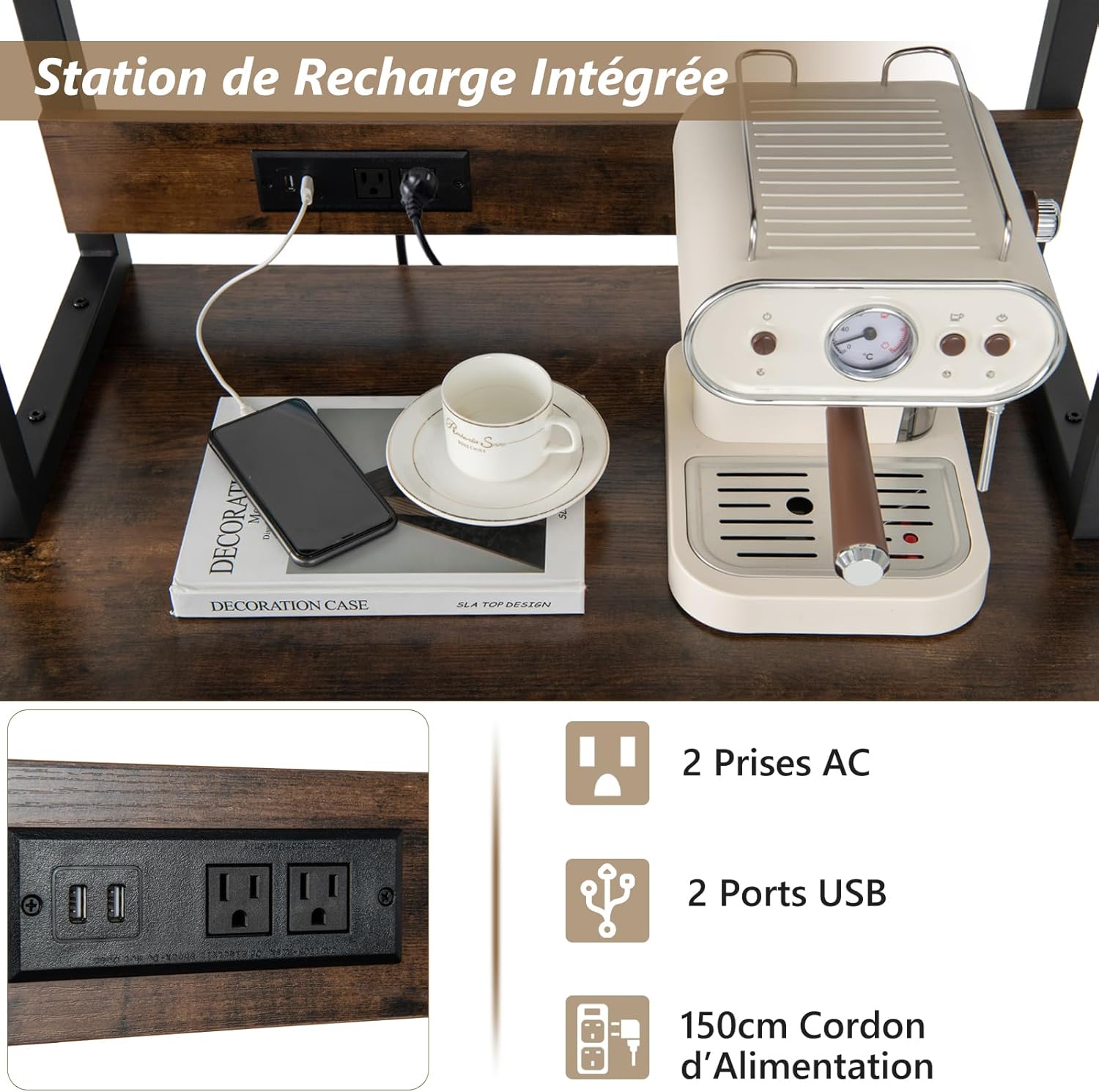 - Prises de courant intégrées : Notre table de casier à vin est équipée de 2 prises AC (220-250V/16A) et de 2 ports USB (5V/2A). Ce design humanisé facilite la recharge des appareils électroniques tels que la cafetière, la bouilloire à eau chaude et d’autres accessoires de bar, apportant plus de commodités.