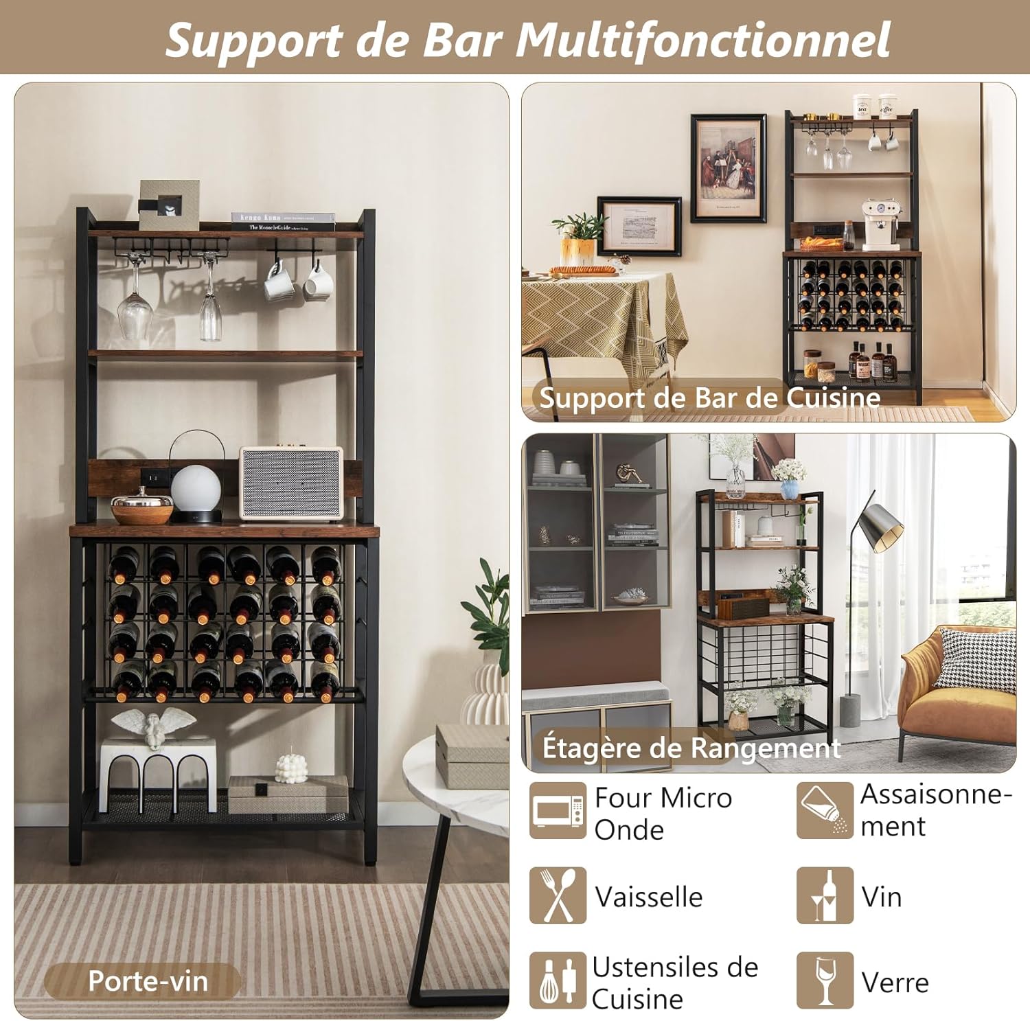 - Grande capacité de stockage : Notre casier à vin dispose de 3 étagères de rangement, plusieurs crochets pour suspendre des verres et un large comptoir. Il peut contenir au maximum 9 verres à vin et 24 bouteilles, et le comptoir spacieux de 48cm convient pour ranger le café et le four micro-ondes.