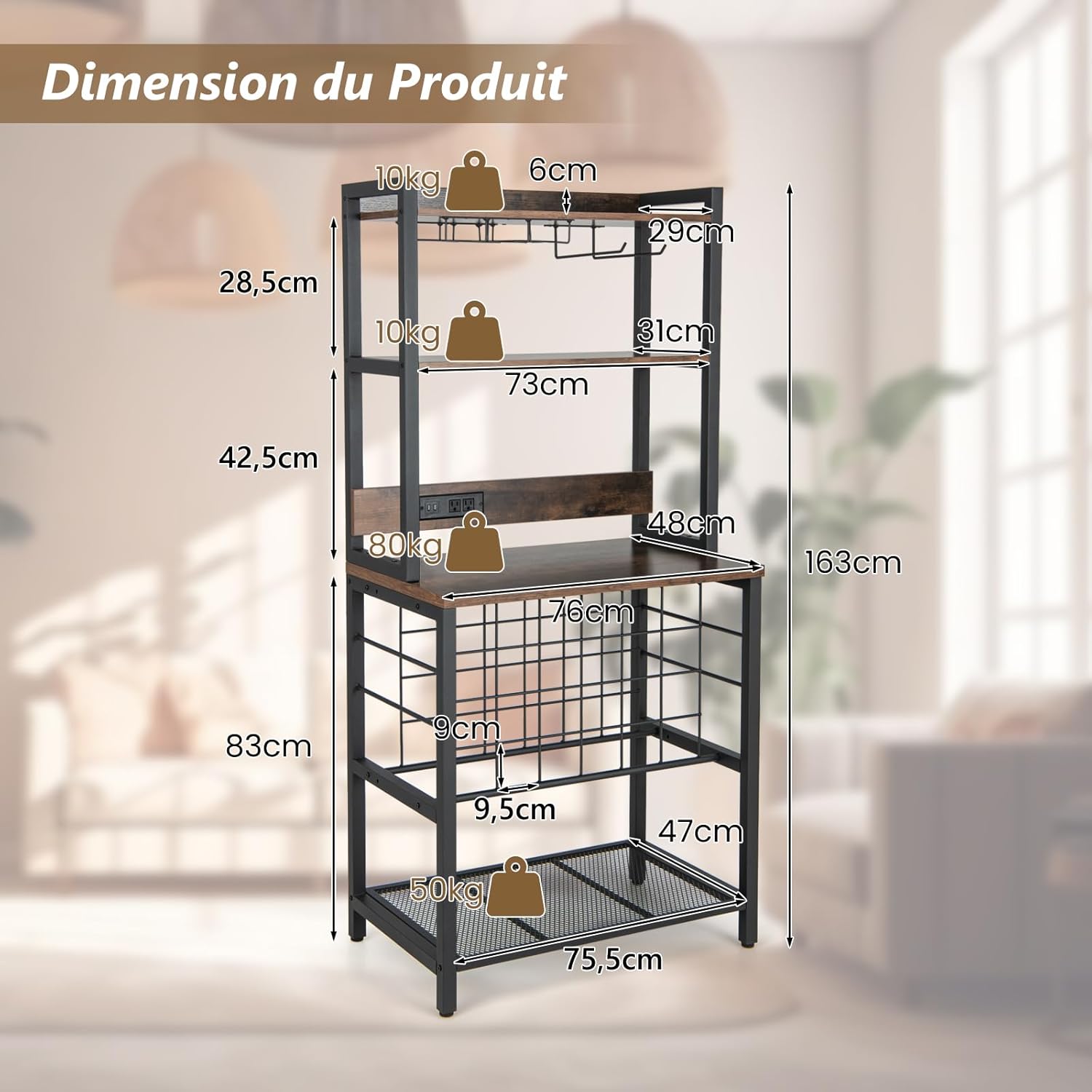 - Construction robuste et stable : Notre porte-bouteille est conçu avec un cadre en métal solide,un dispositif antibasculent et des pieds réglables. Le comptoir peut supporter un poids de 80 kg, et l’étagère inférieure pour pochoir du meuble peut atteindre 150 kg, vous pouvez l’utiliser en toute confiance.