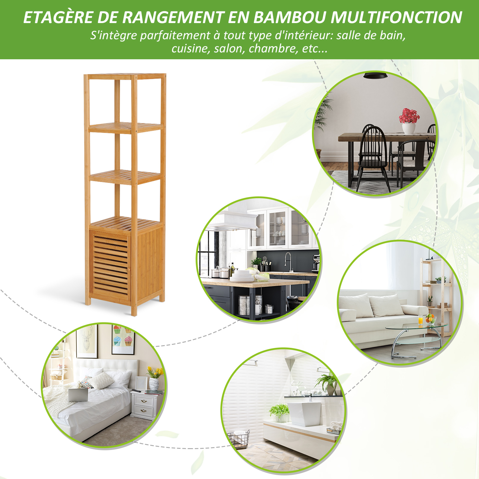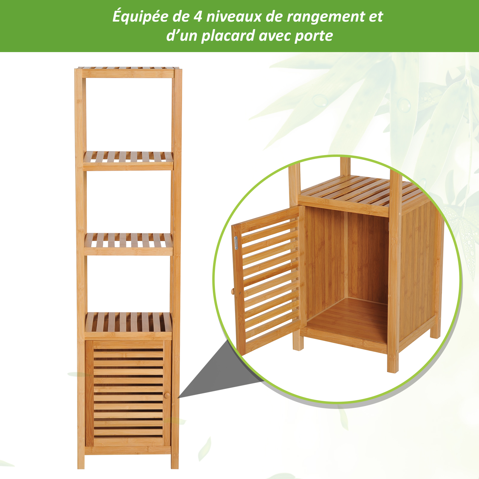 | Libellé | Meuble colonne rangement salle de bain bambou design naturel 36L x 33l x 140H cm 2 étagères 4 niveaux + placard |