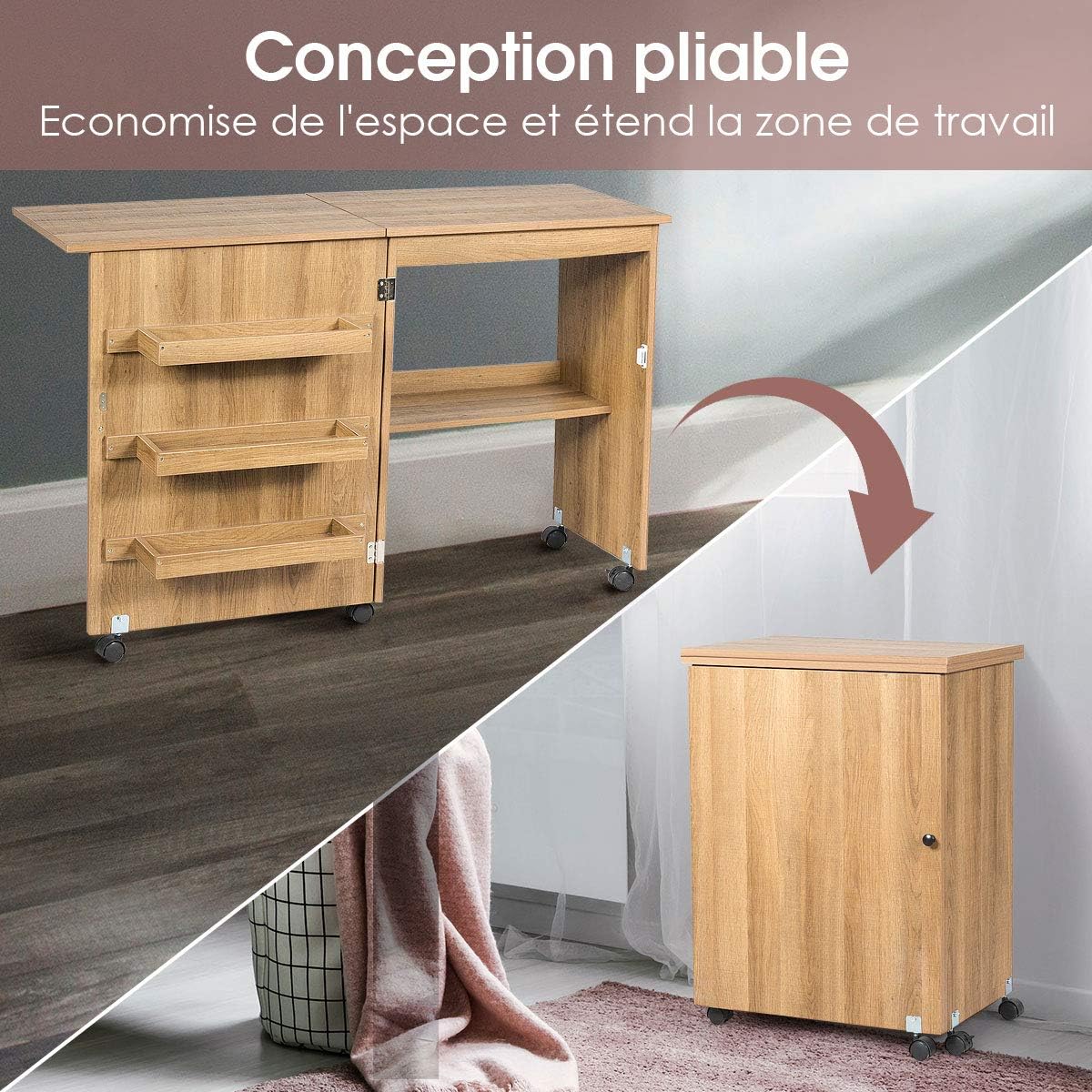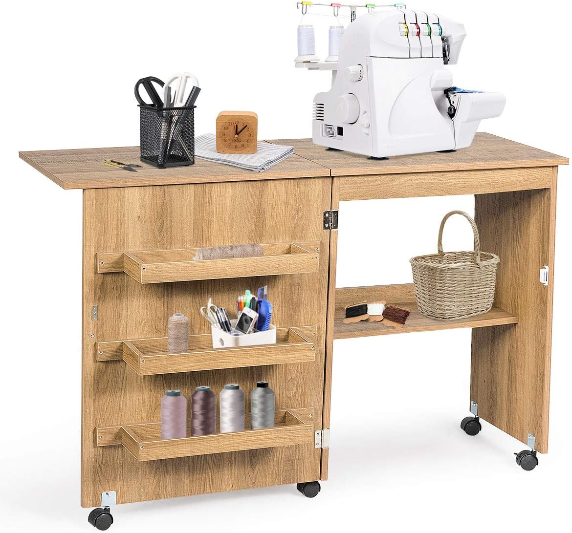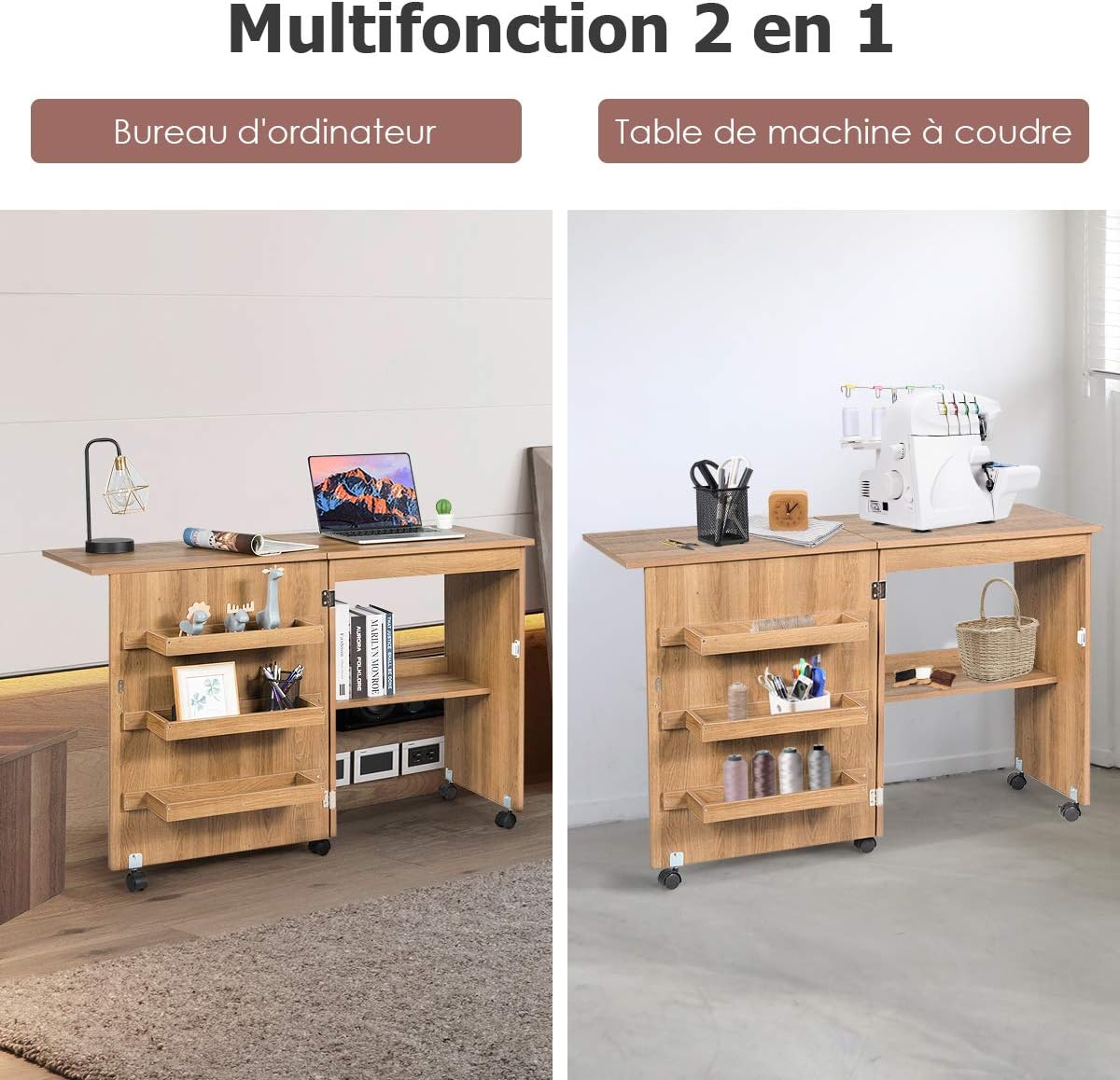 Meuble couture, table couture avec 3 étagères et 1 plateau machine à coudre, 2 en 1 bureau pliable
