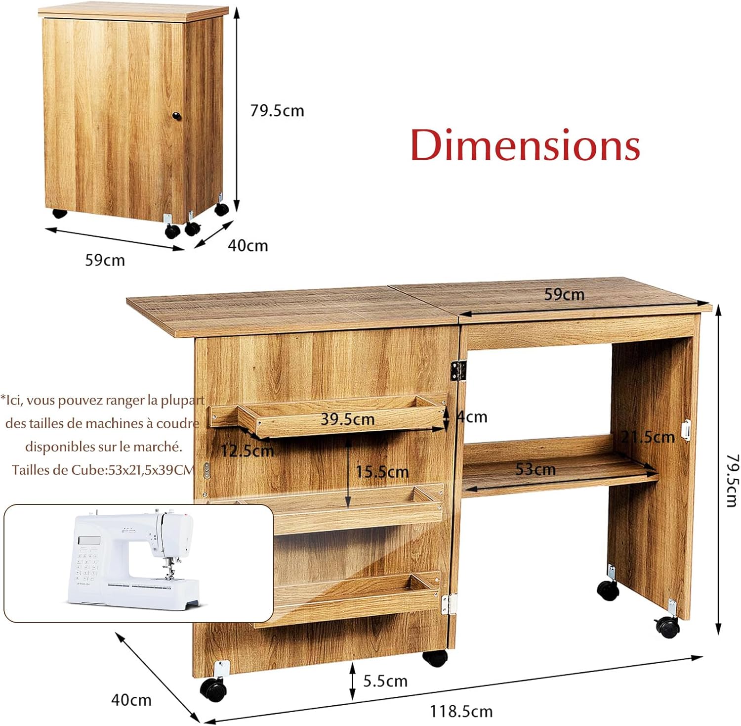 - Optimisation spatiale signée meuble couture: Design pliable breveté (59×40×79,5 cm replié) + 3 étagères+ 1 Plateau(cube) spécialement conçu pour machine à coudre(53Lx21,5lx39H CM). Stockez fils, livres et accessoires de machine à coudre sans encombrer votre intérieur. Une solution esthétique pour petits espaces.