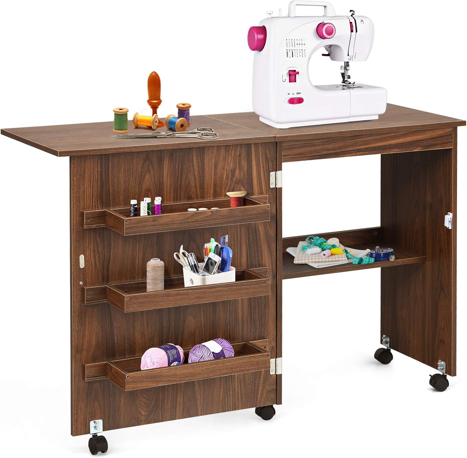 Meuble couture, table couture avec 3 étagères et 1 plateau machine à coudre, 2 en 1 bureau pliable