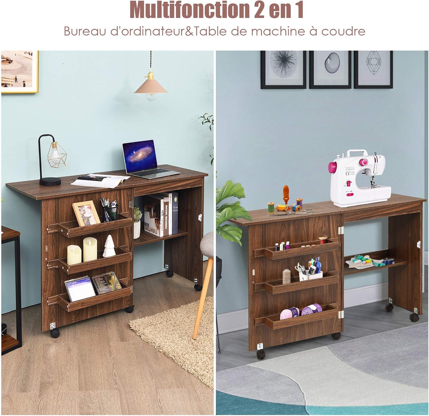 Meuble couture, table couture avec 3 étagères et 1 plateau machine à coudre, 2 en 1 bureau pliable