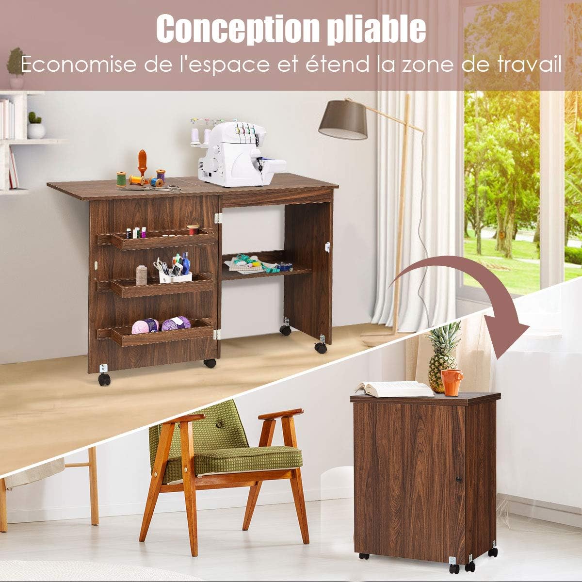 - Mobilité professionnelle pour table couture:4 roulettes silencieuses (dont 2 verrouillables) permettent de déplacer votre table entre pièces en un geste. La conception pliable et stabilité accrue vous permet de coudre dans un petit espace (même votre petit appartement parisien, retoucherie) pour travaux minutieux.