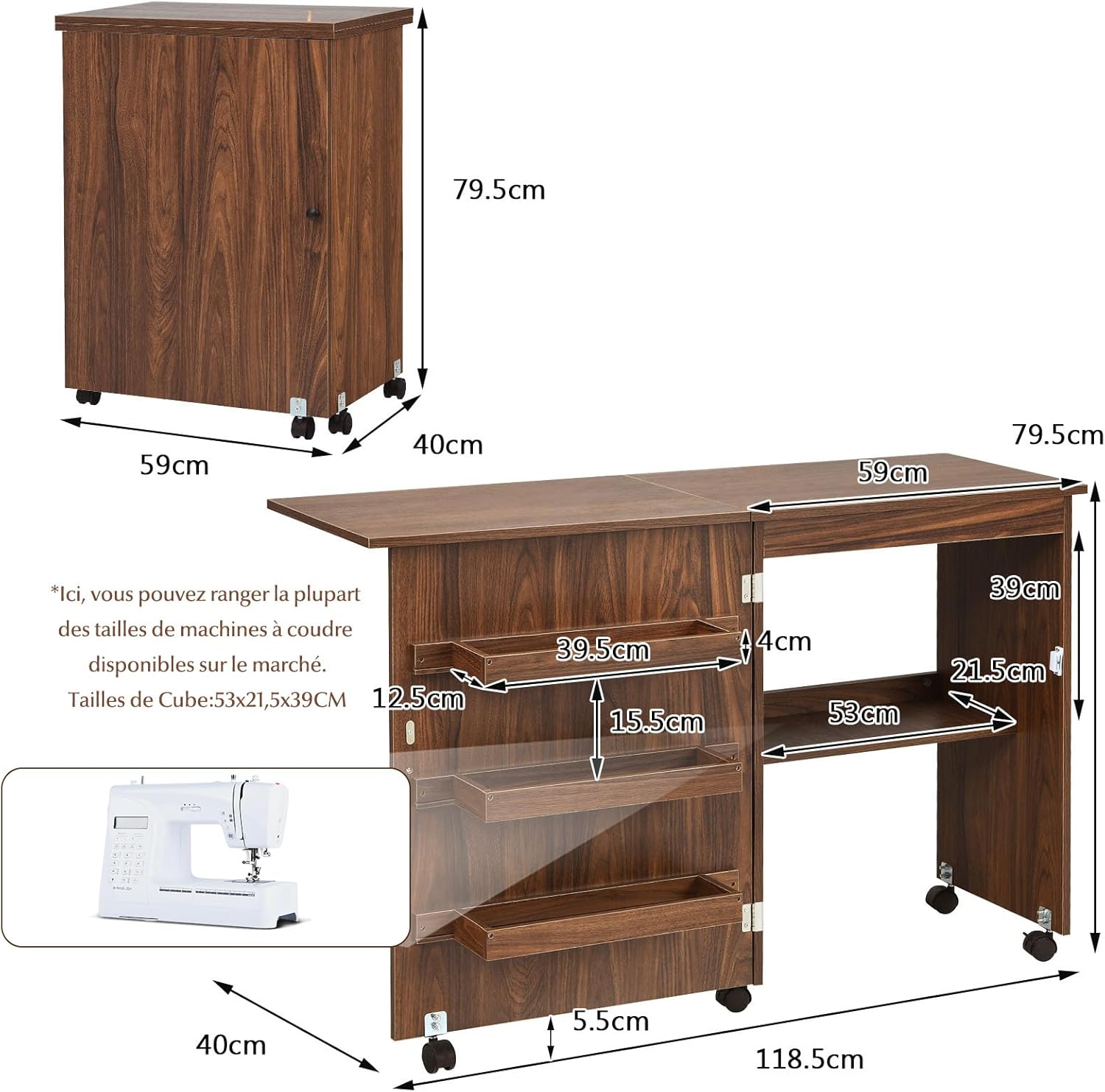- Optimisation spatiale signée meuble couture: Design pliable breveté (59×40×79,5 cm replié) + 3 étagères+ 1 Plateau(cube) spécialement conçu pour machine à coudre(53Lx21,5lx39H CM). Stockez fils, livres et accessoires de machine à coudre sans encombrer votre intérieur. Une solution esthétique pour petits espaces.