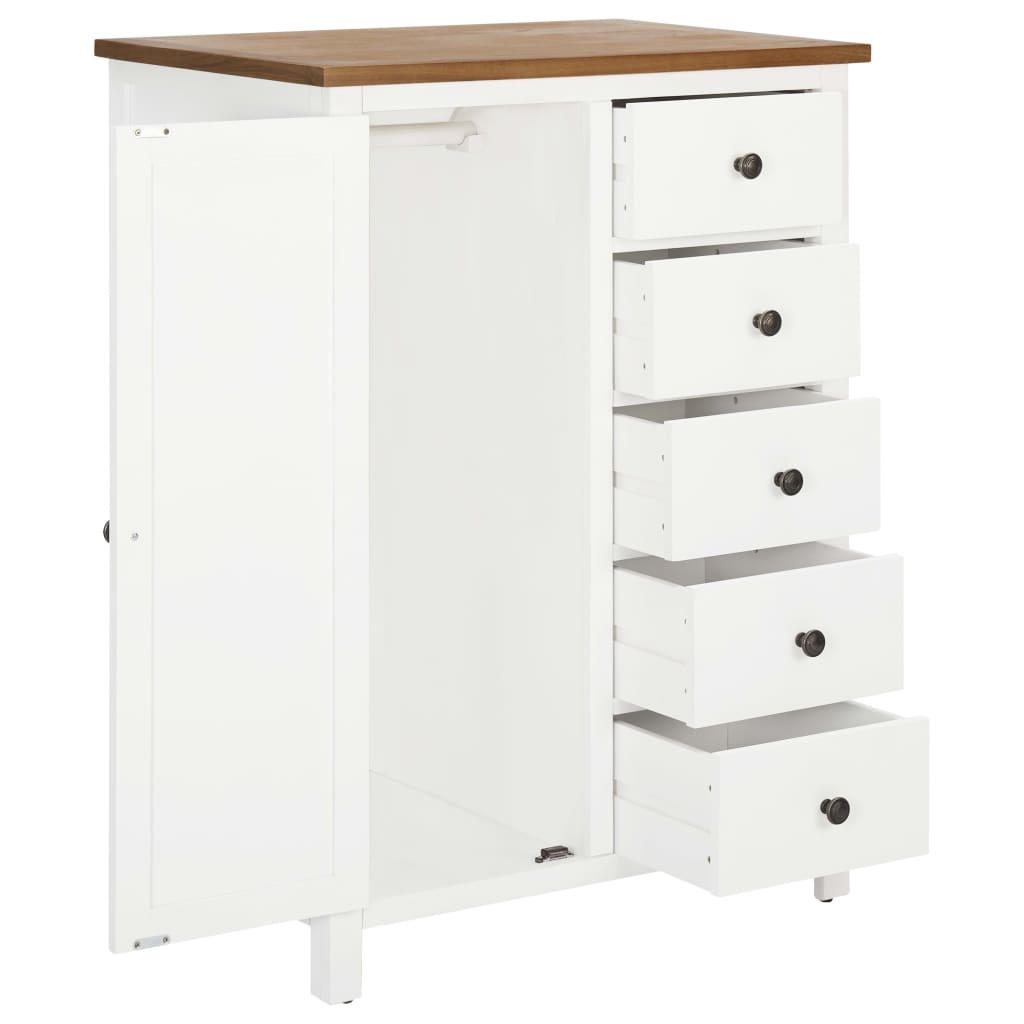 Gardez tous vos biens précieux en sécurité dans notre armoire en bois. Cette armoire à vêtements a un dessus en bois de chêne massif et en MDF avec placage de chêne, avec un corps en bois d'acacia massif. Les grains de bois à face transparente rendent chaque meuble de rangement légèrement différent l'un de l'autre. Quoi de plus ! Il comprend un compartiment avec penderie et cinq tiroirs, offrant amplement d'espace pour vos tenues plus longues et autres vêtements ou accessoires pliés. Remarque importante: la couleur et le grain peuvent varier d'une pièce à l'autre, ce qui rend chacune de nos armoires de chambre à coucher unique. Couleur : Chêne et blanc Matériau : bois de chêne massif, MDF avec placage de chêne, bois d'acacia massif Dimensions : 76 x 52 x 105 cm (l x P x H) Avec 1 porte, 1 penderie en bois intégrée et 5 tiroirs Finition : dessus (finition naturelle), le reste (peinture blanche) L'assemblage est requis