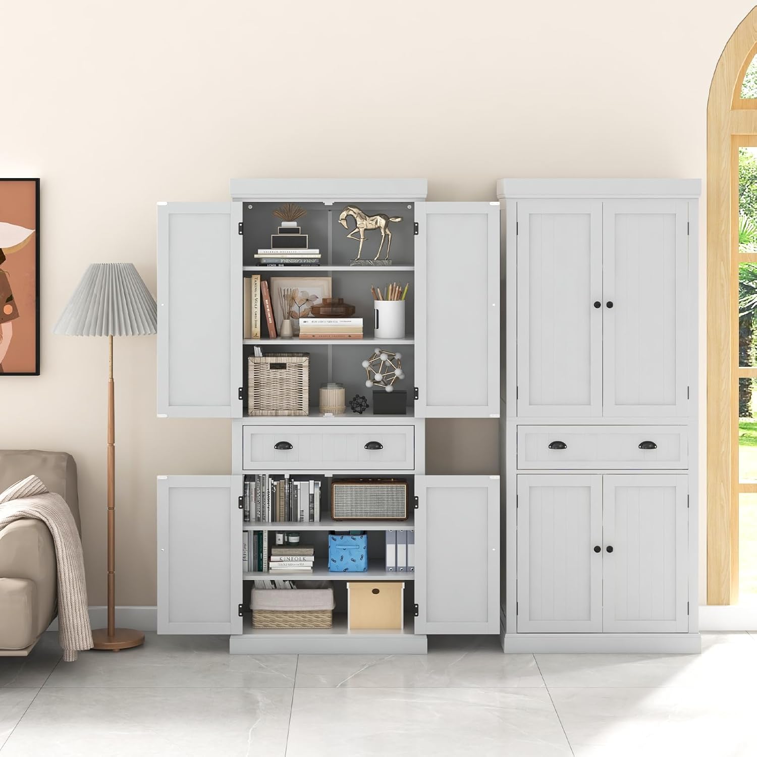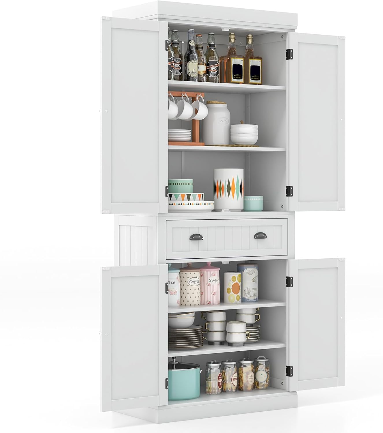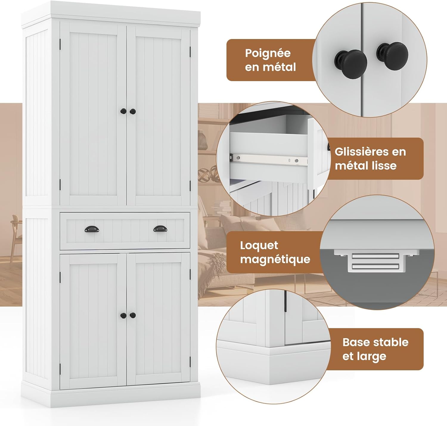 L'armoire de rangement est équipée d'un placard à 4 portes et d'un grand tiroir pour vous aider à mieux ranger et organiser vos provisions. De plus, il y a quatre étagères ajustables dans le placard à deux portes supérieur et inférieur pour répondre à différents besoins. Pour une structure fiable, les dispositifs de prévention des chutes peuvent fixer fermement l'armoire au mur pour éviter tout basculement. De plus, l'aspect classique dégage une sensation de qualité et d'élégance qui peut être combinée avec n'importe quel style de pièce, que ce soit dans la cuisine, la salle à manger ou le salon.