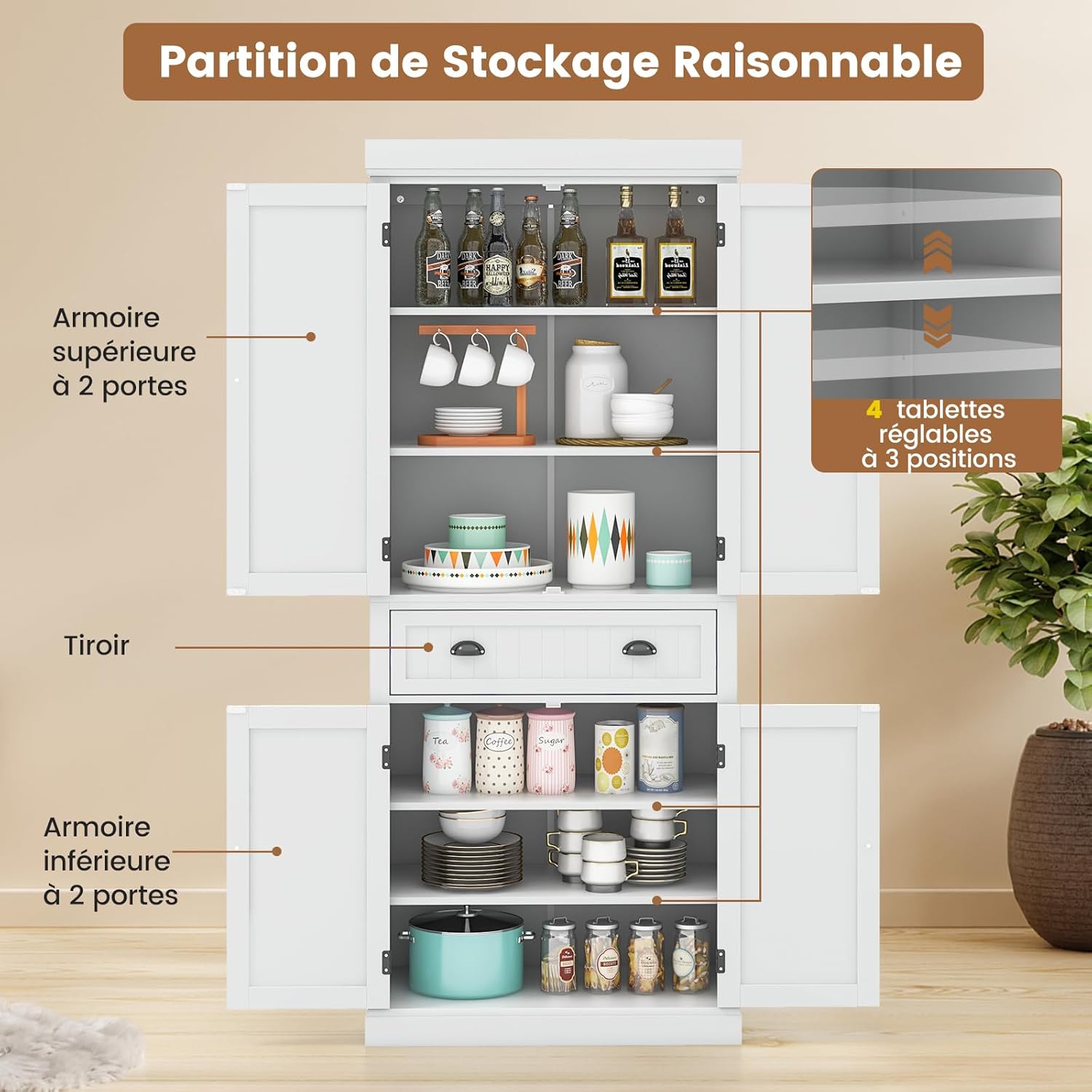 - 4 étagères ajustables en 3 positions : Que vous vouliez ranger des bouteilles plus grandes ou des ustensiles de cuisine, il suffit d'ajuster les étagères dans les armoires à la hauteur requise. Ce design réfléchi garantit que vous utilisez efficacement l'espace du placard et maximisez le potentiel de stockage.