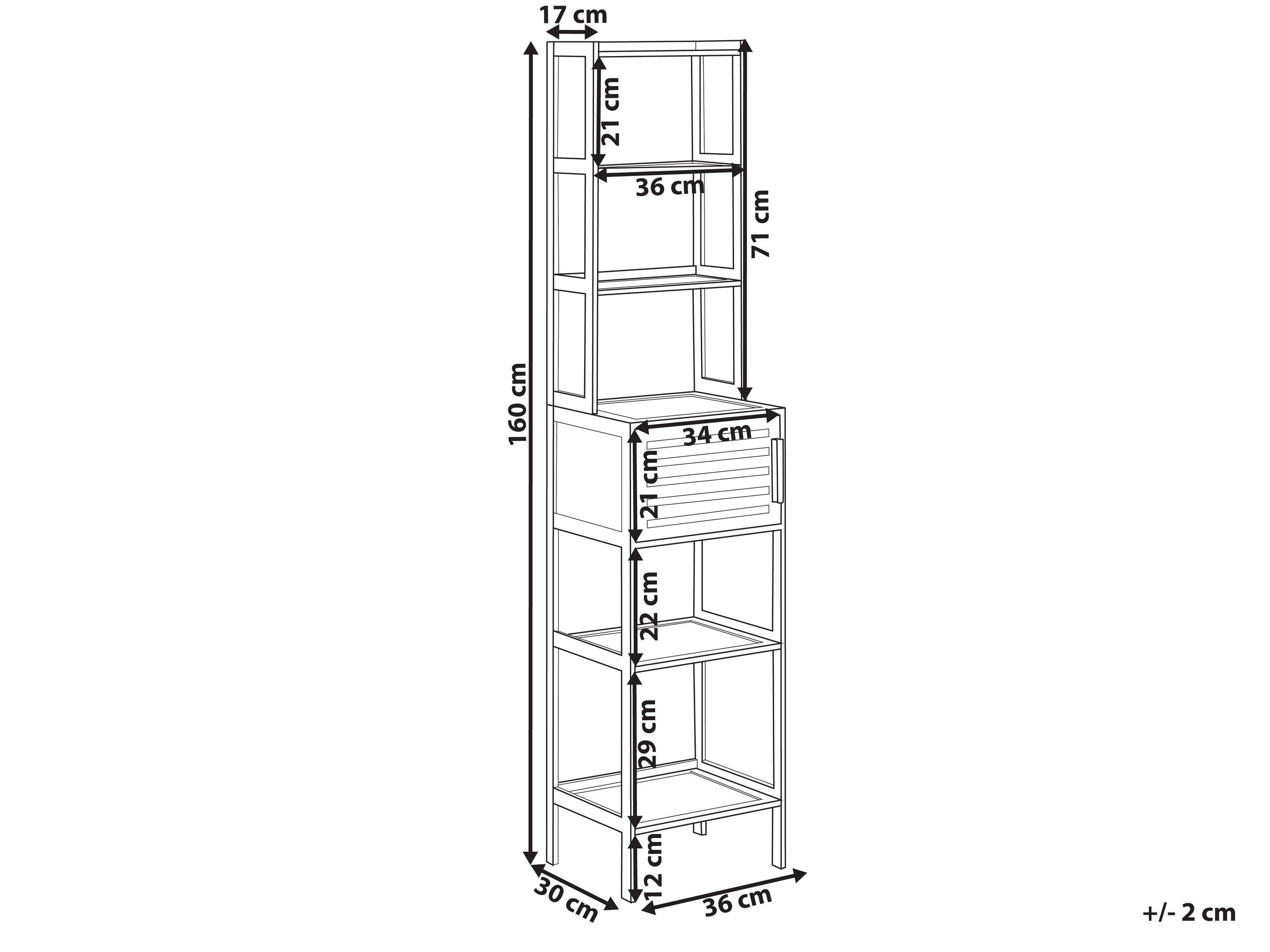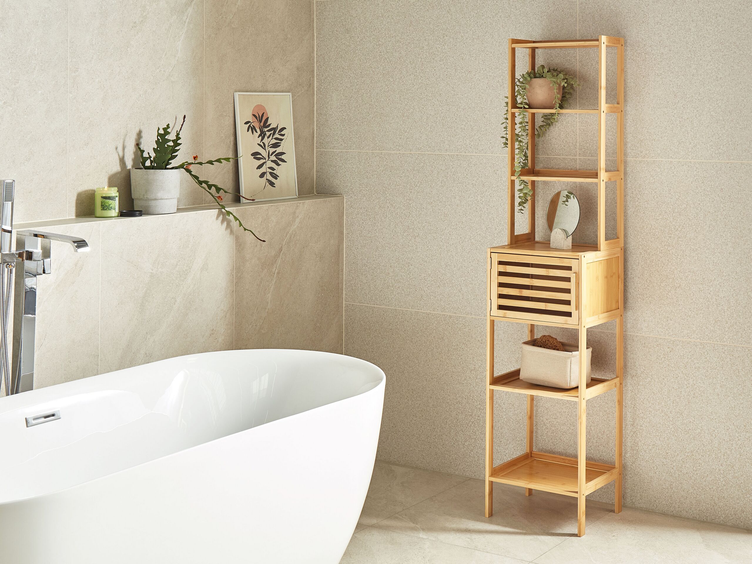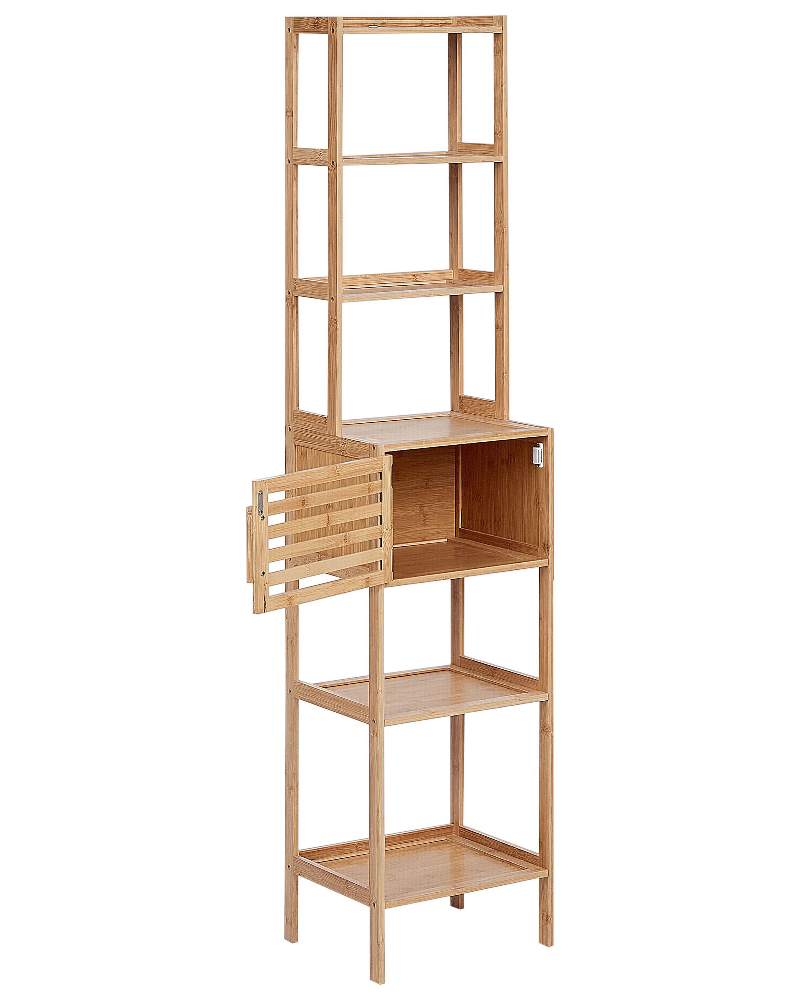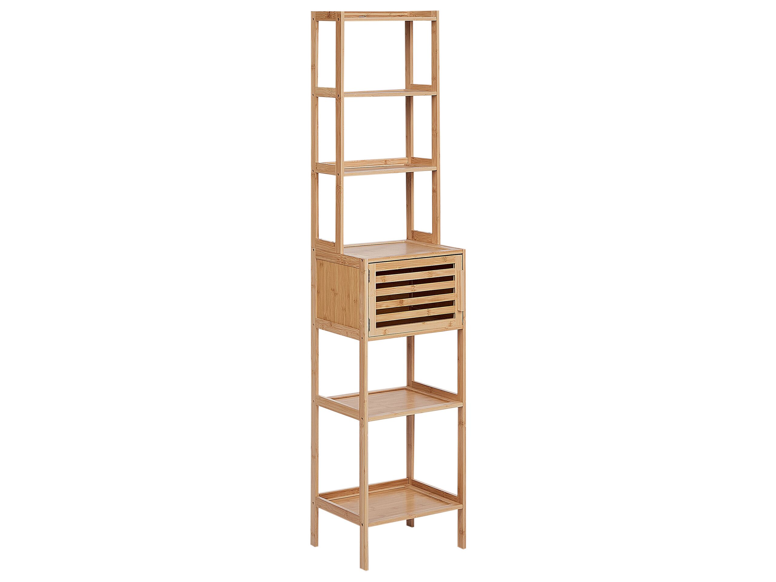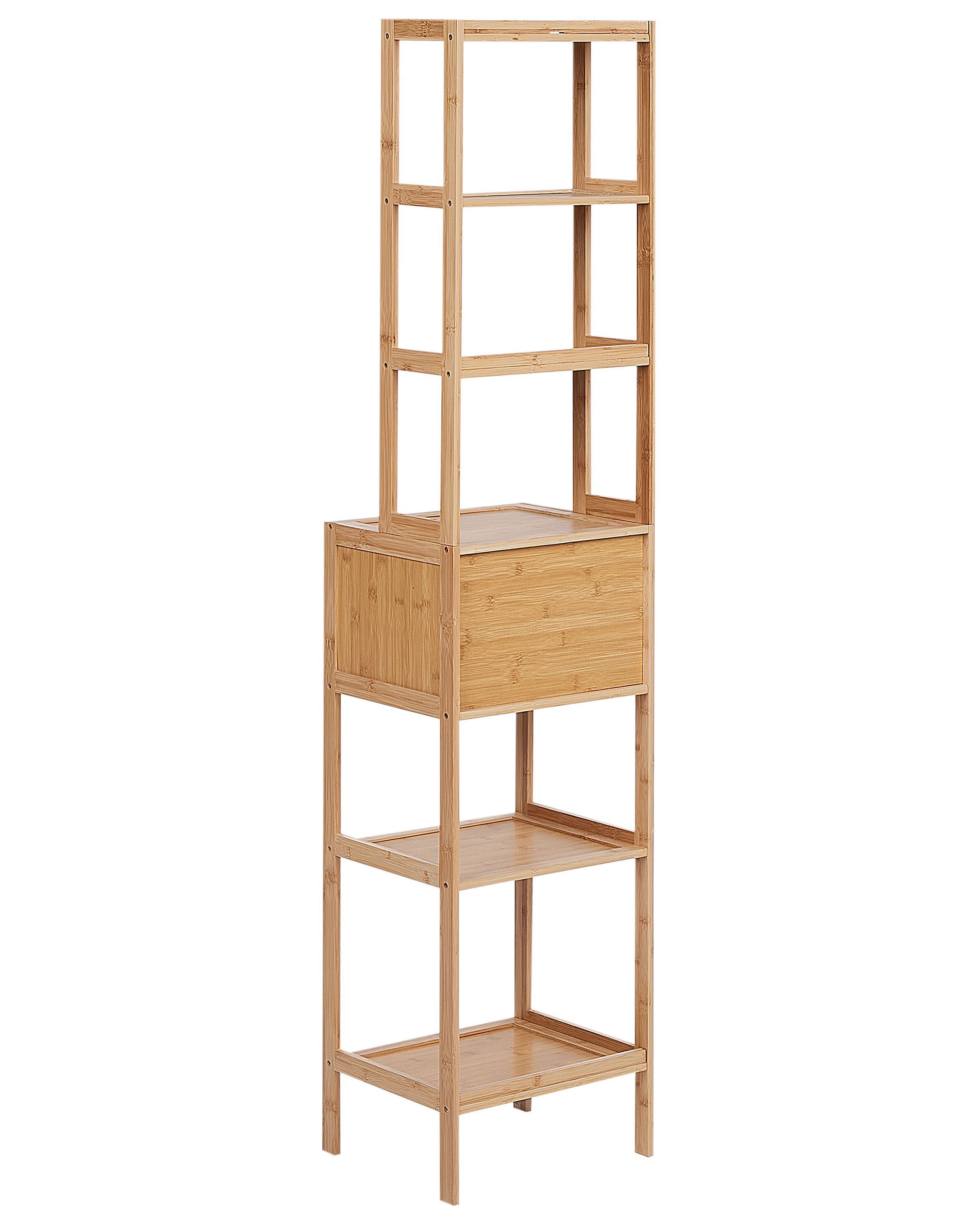 Etagère haute pour salle de bains. Cette étagère de salle de bains est fabriquée en bambou de haute qualité, avec une finition naturelle qui s'adapte à tous les décors. Le meuble comprend six étagères, offrant suffisamment d'espace pour ranger les serviettes, les articles de toilette et d'autres objets indispensables à la salle de bains. En outre, une des tablettes est dotée d'une porte, ce qui permet de dissimuler les objets à ranger. Son design vertical est peu encombrant, ce qui en fait un meuble idéal pour les salles de bains à l'espace limité.