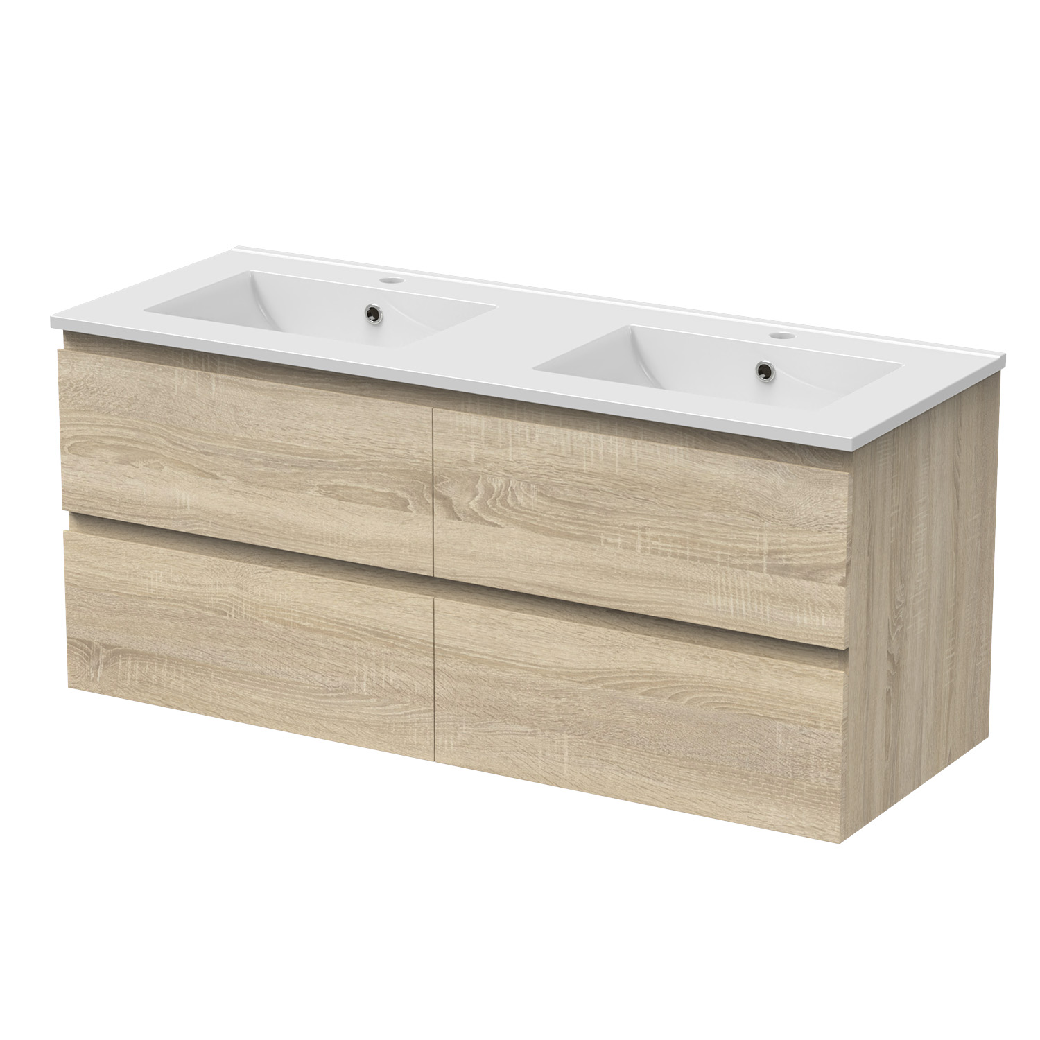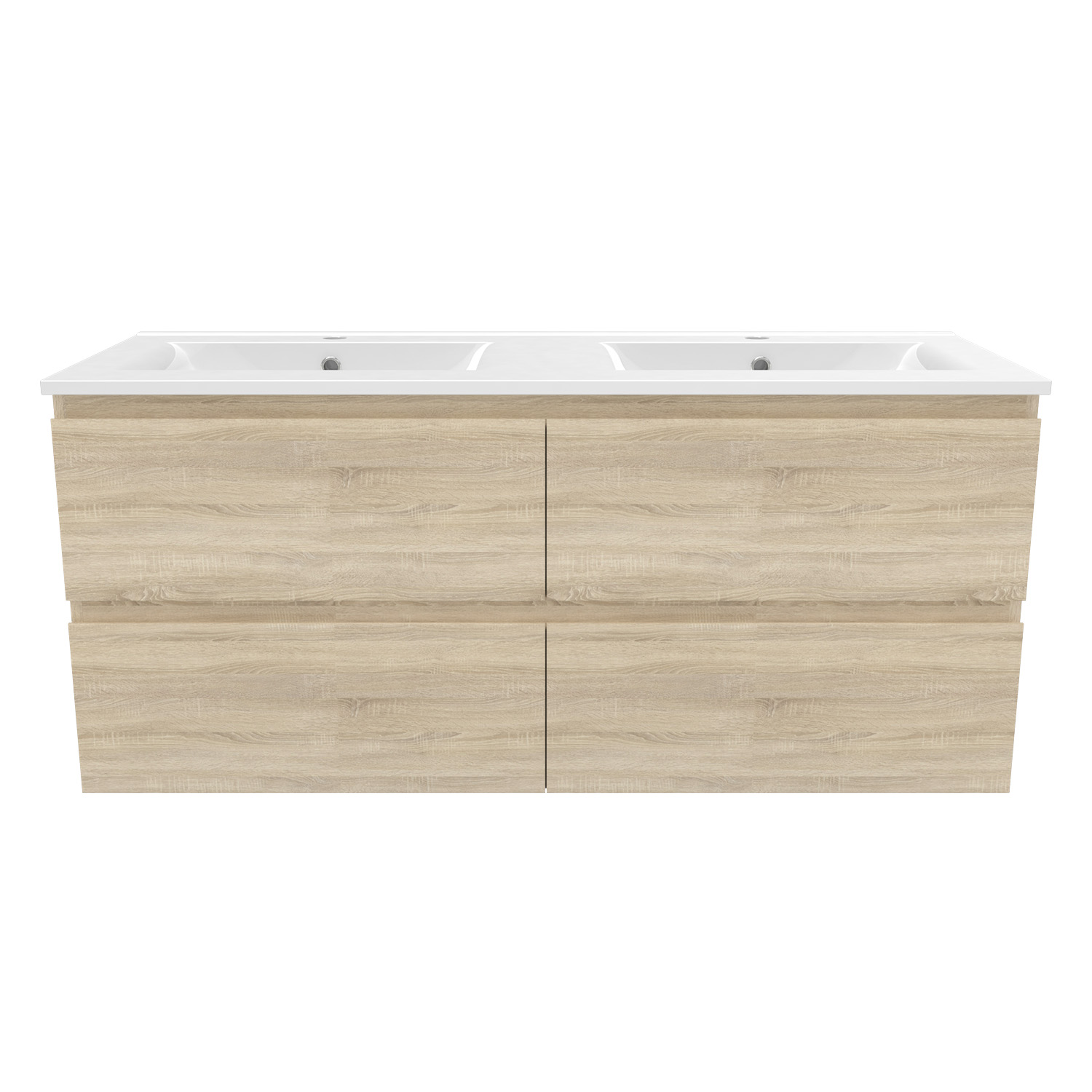 Le meuble suspendu de salle de bain avec 4 tiroirs au charme intemporel, la sobriété d’un design minimaliste et la modernité d’un plan double vasques en céramique.