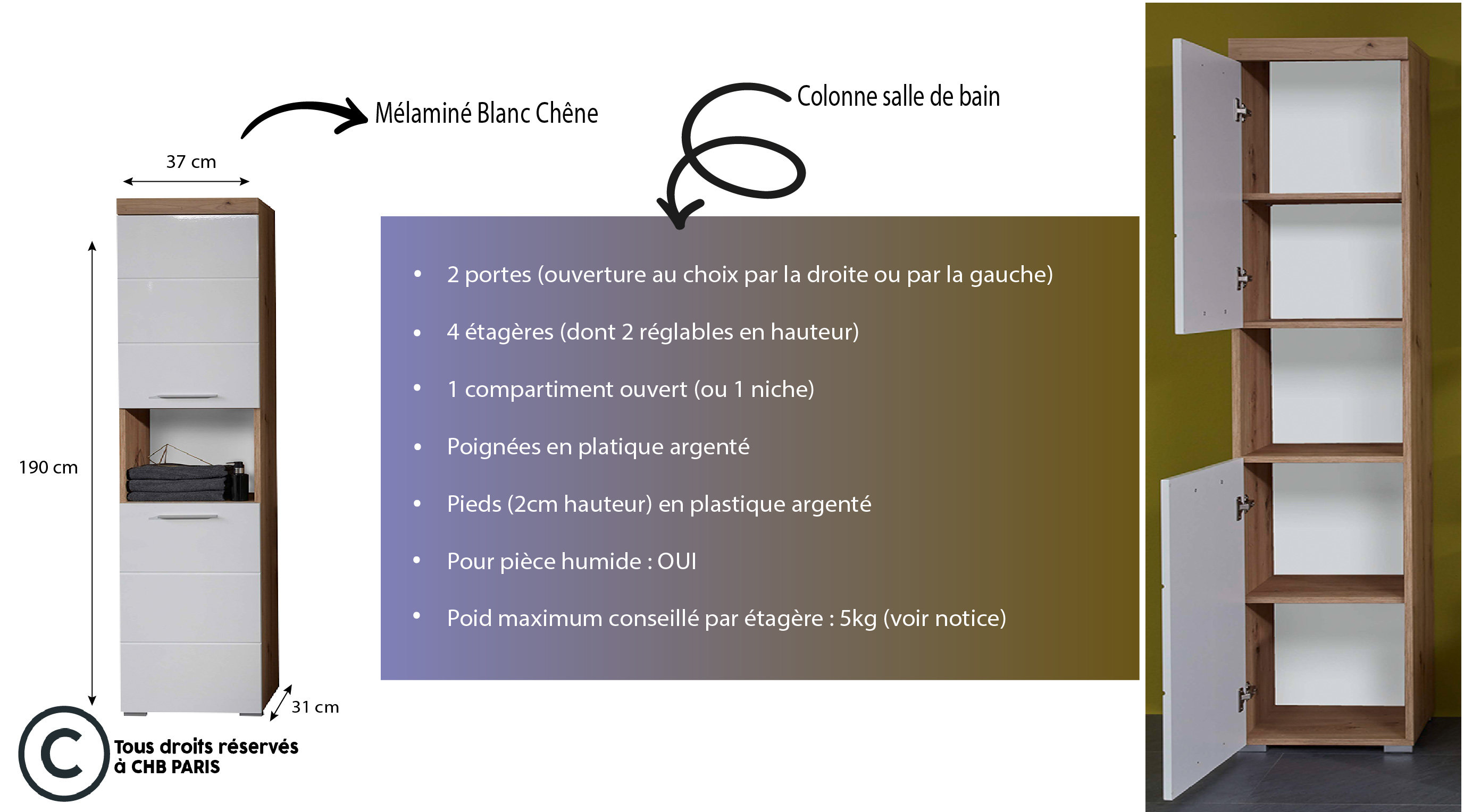 | Libellé | Meuble de salle de bain mélaminé - Meuble Colonne. Blanc-Chêne brillant. L-H-P : 37 - 190 - 31 cm |