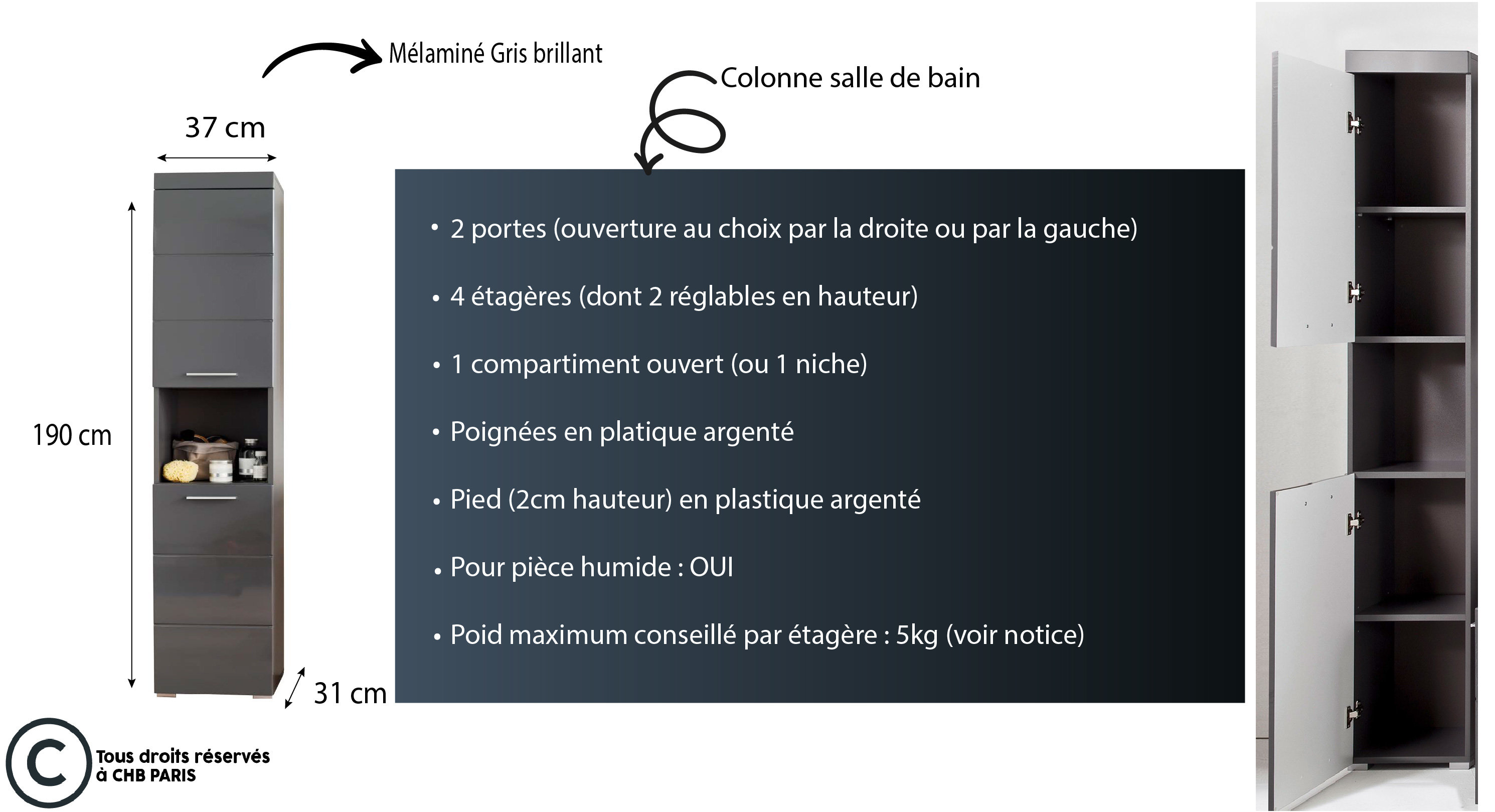 | Libellé | Meuble de salle de bain mélaminé - Meuble Colonne. Gris. L-H-P : 37 - 190 - 31 cm |