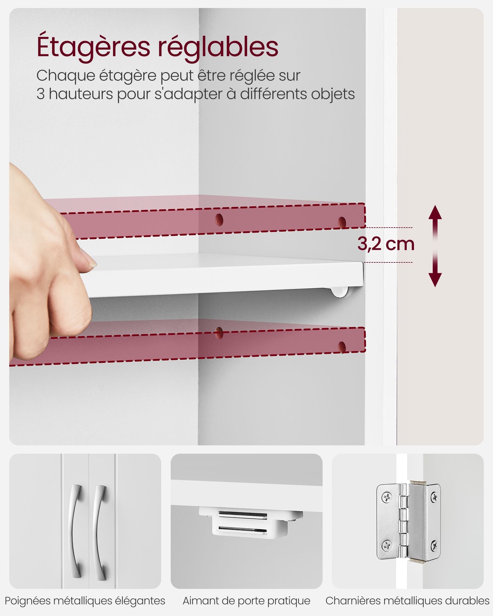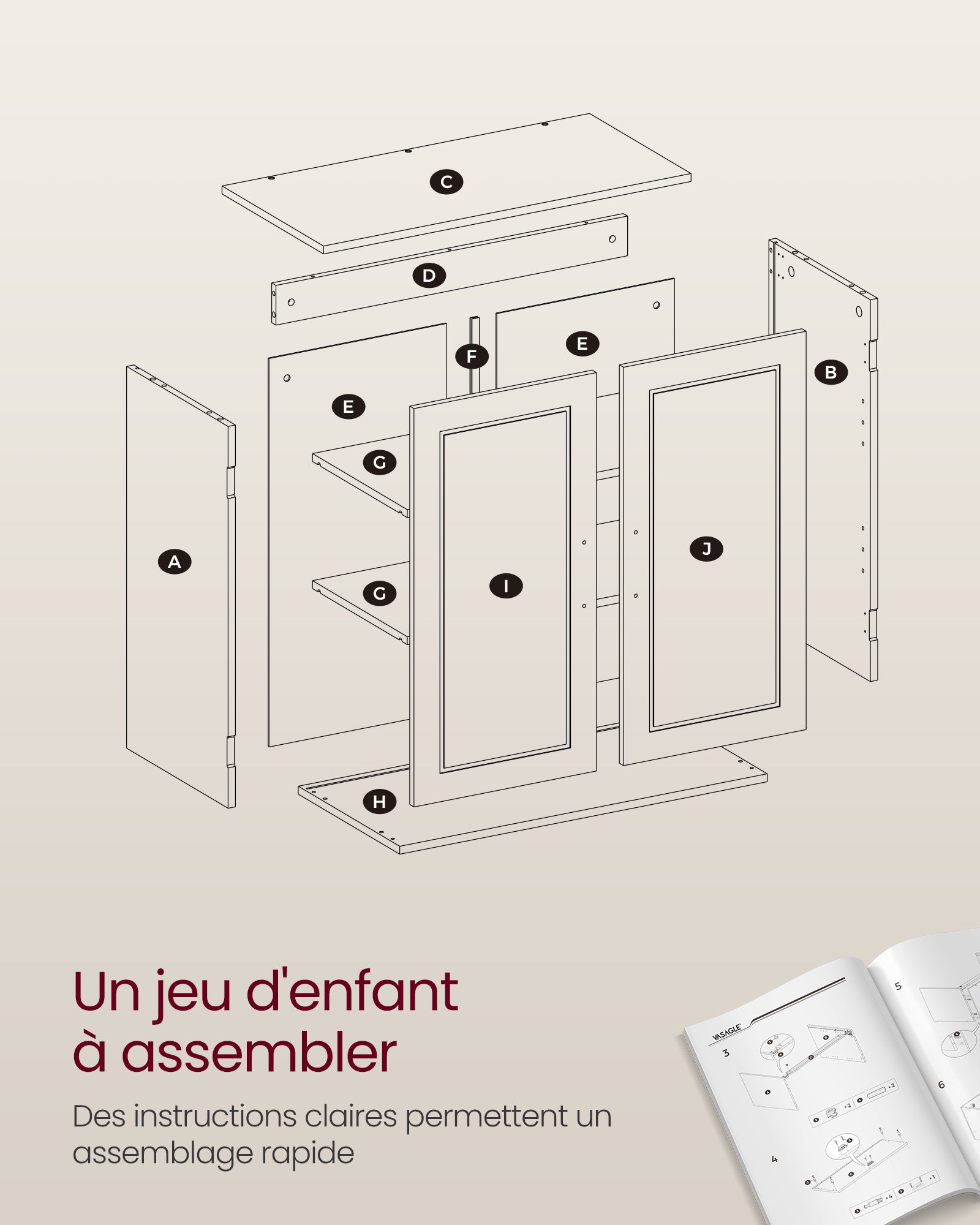 Le montage est simple grâce aux pièces numérotées et aux instructions détaillées fournies. Vous pourrez installer rapidement ce meuble et profiter de son espace de rangement sans effort.
