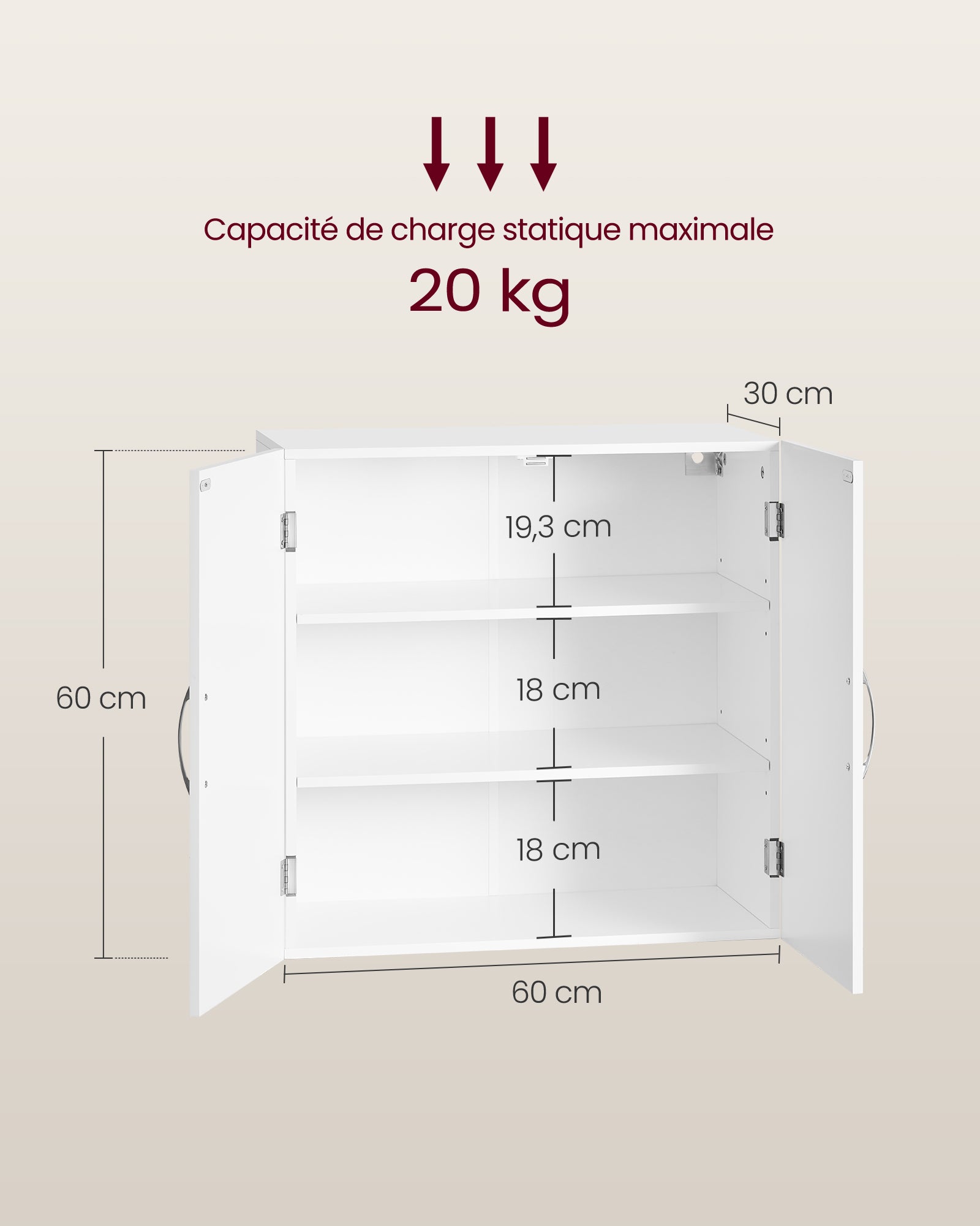 Libellé Meuble de salle de bain placard mural armoire rangement mur 2 portes avec 2 étagères réglables 60 x 18 x 60 cm style scandinave nordique blanc mat 12