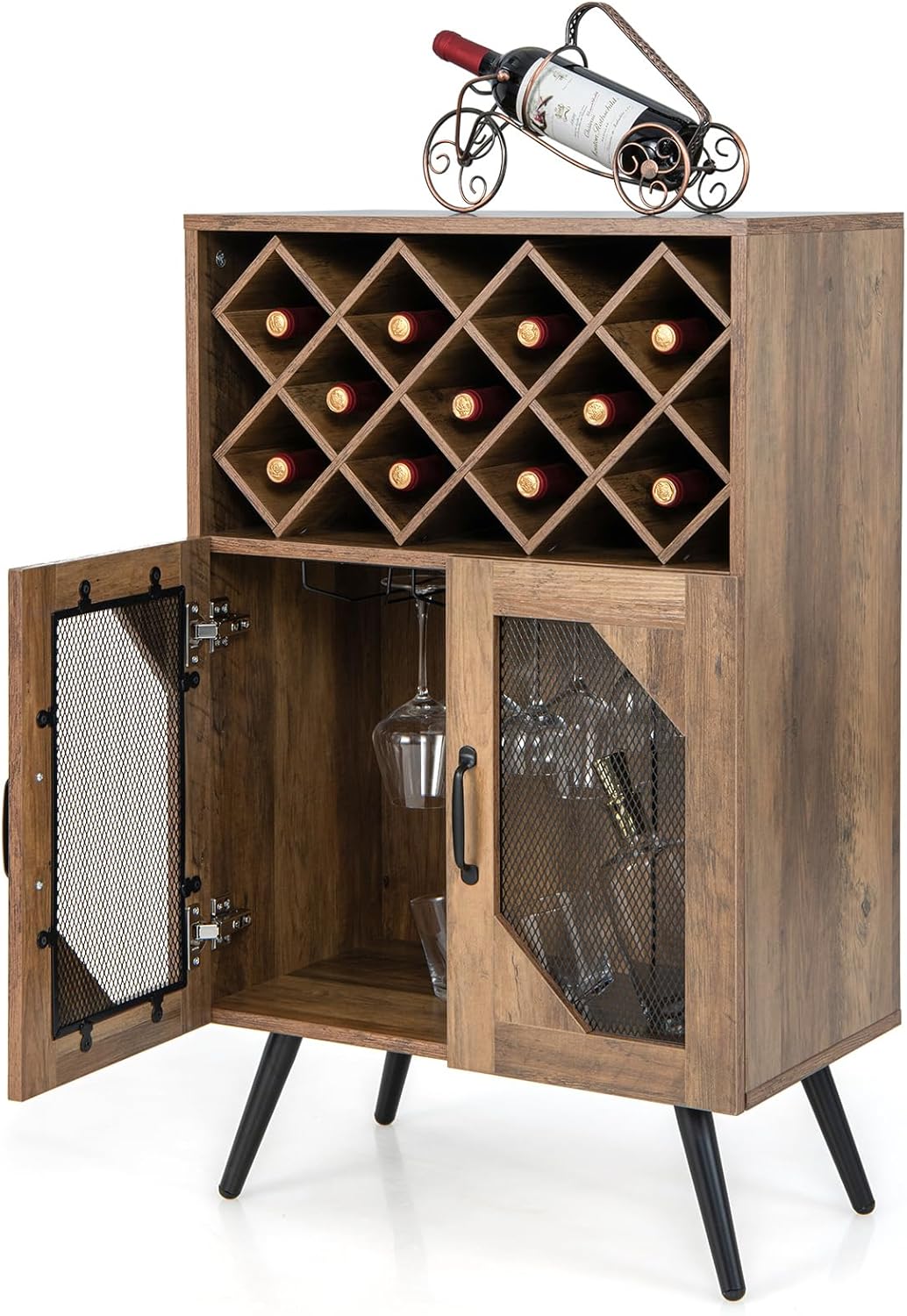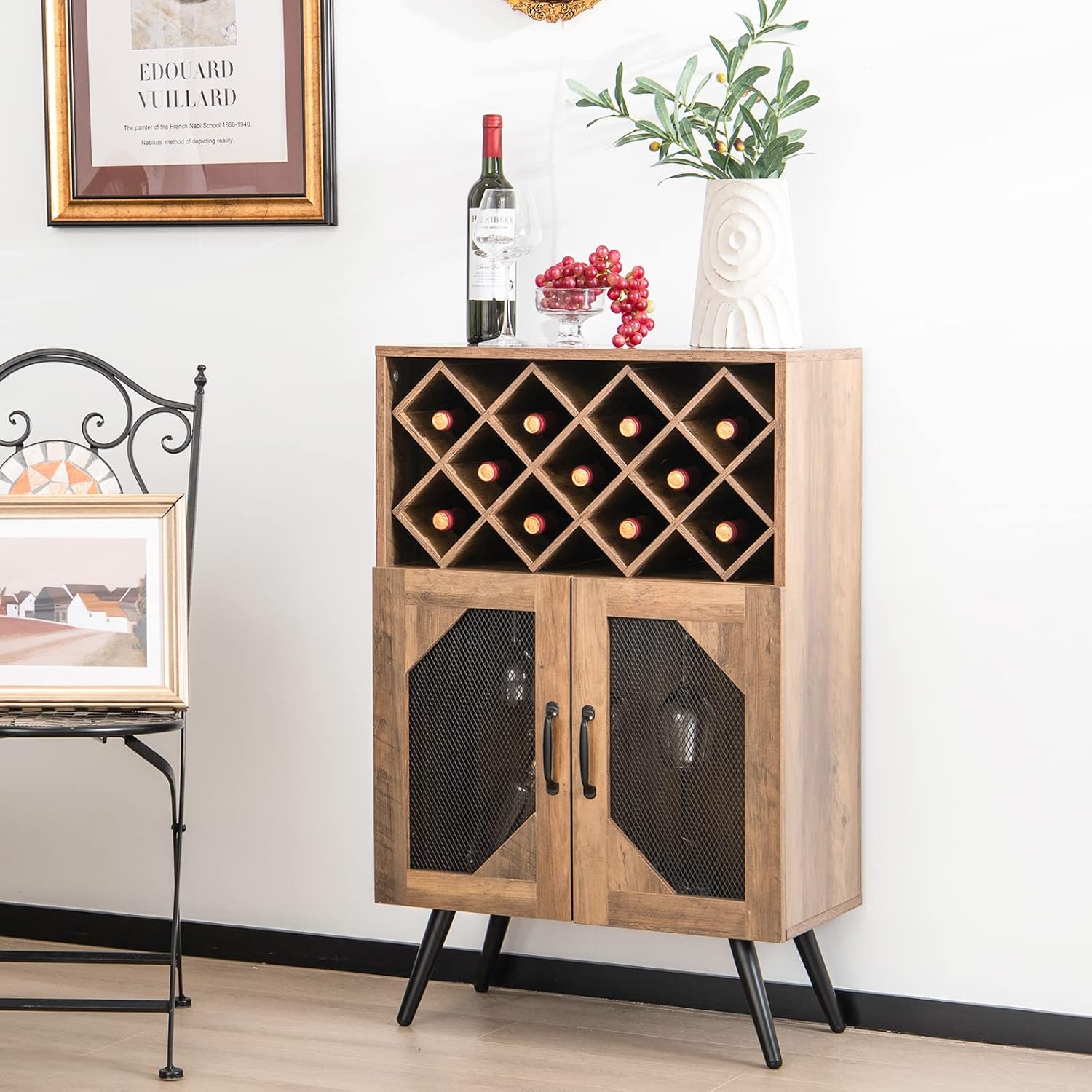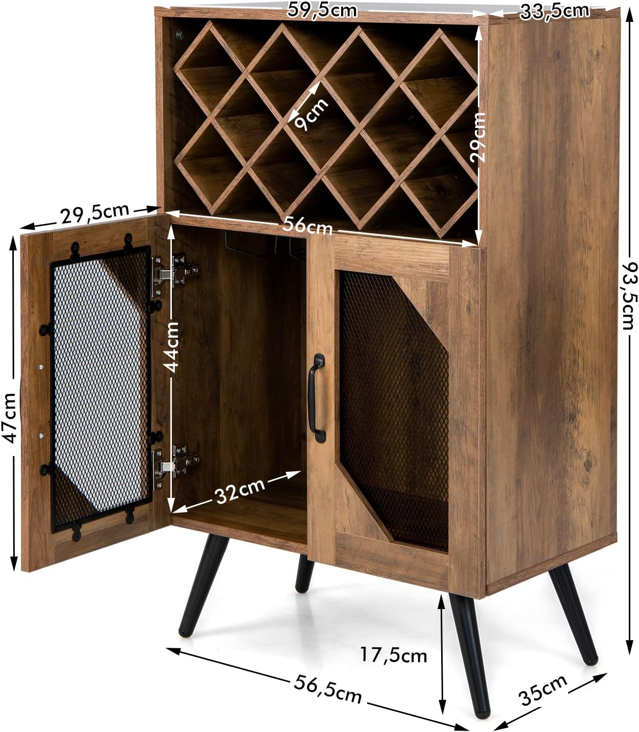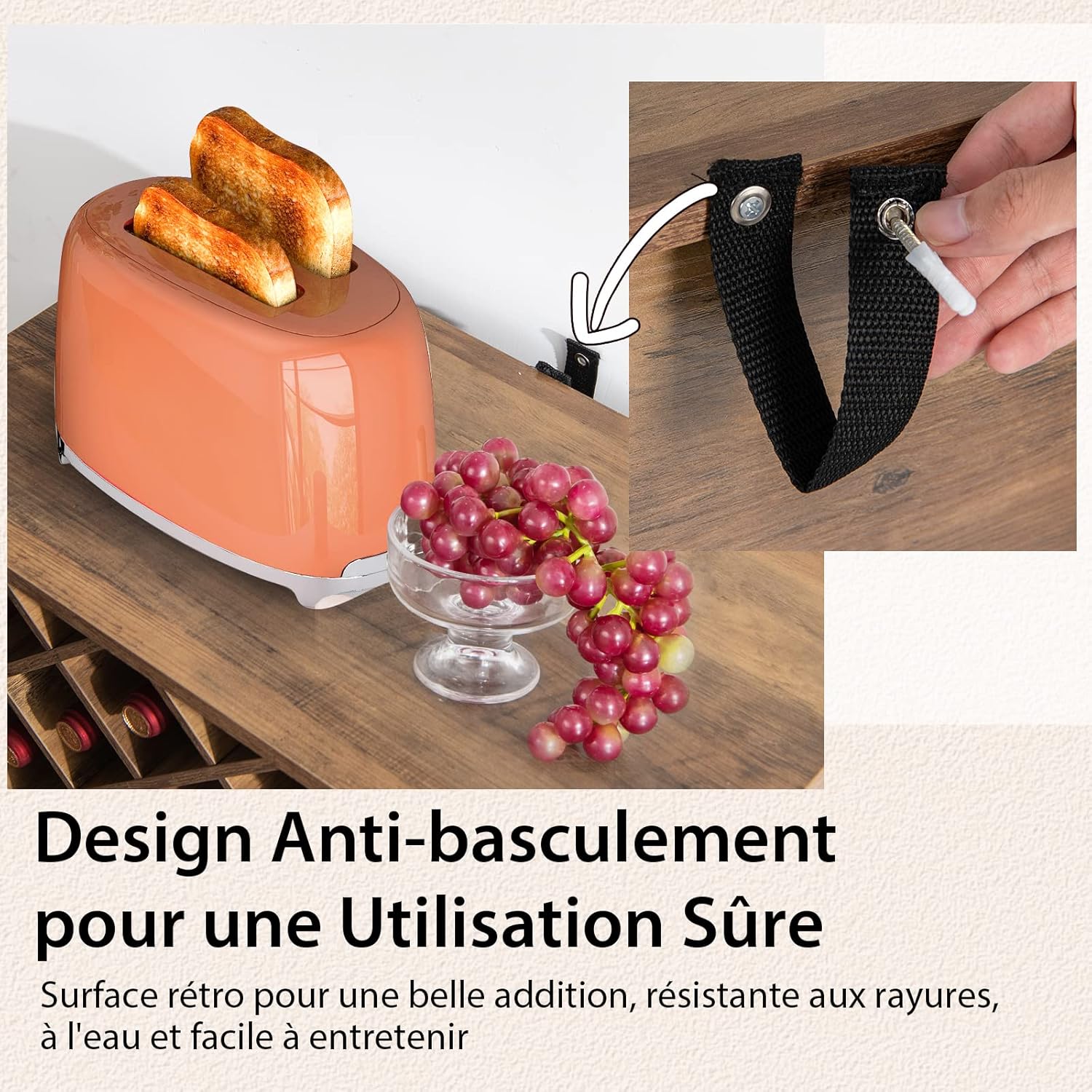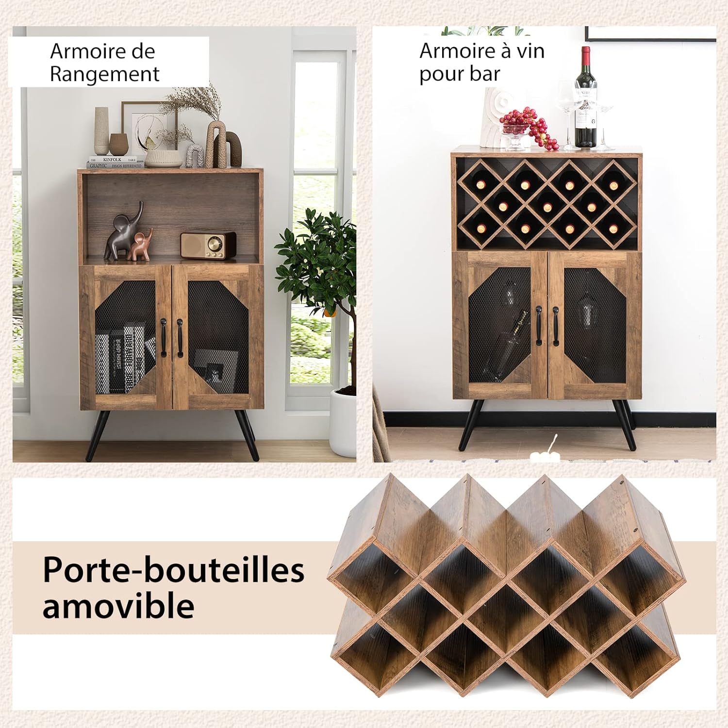 Notre buffet est conçu pour votre collection de vins avec 1 bureau spacieux, un casier à vin 11 bouteilles, 3 rouleaux de porte-verre et 1 grand placard avec portes. La porte en treillis métallique unique met bien en valeur le style rustique et vintage. Et la surface rétro anti-rayures est charmante, imperméable et facile à entretenir. Les pieds robustes soutiennent bien le placard tandis que les patins antidérapants protègent le sol des rayures. Et équipé d'un design anti-basculement, ce meuble bar est plus sûr à utiliser. En outre, avec un casier à vins amovible, ce placard à vins peut se transformer en bibliothèque, buffet de cuisine pour une utilisation polyvalente.
