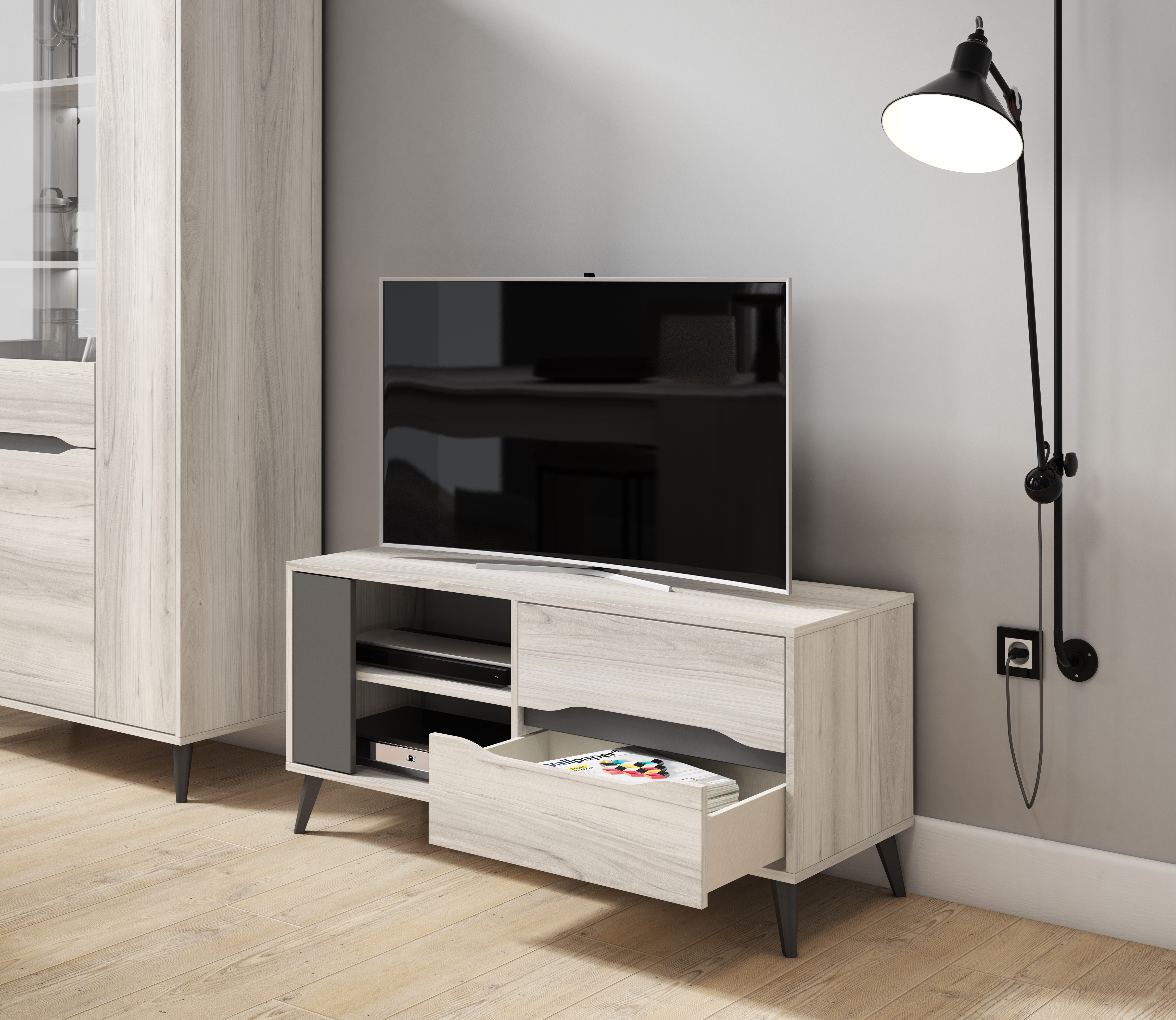 Meuble TV 110, 2 tiroirs + 1 porte, salon, Modèle KAI, couleur Chêne, Gris, mesures 113x40x52 cm hauteur.