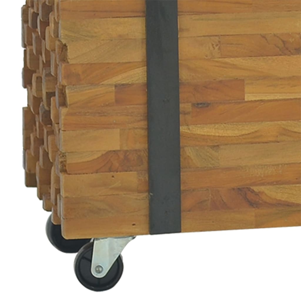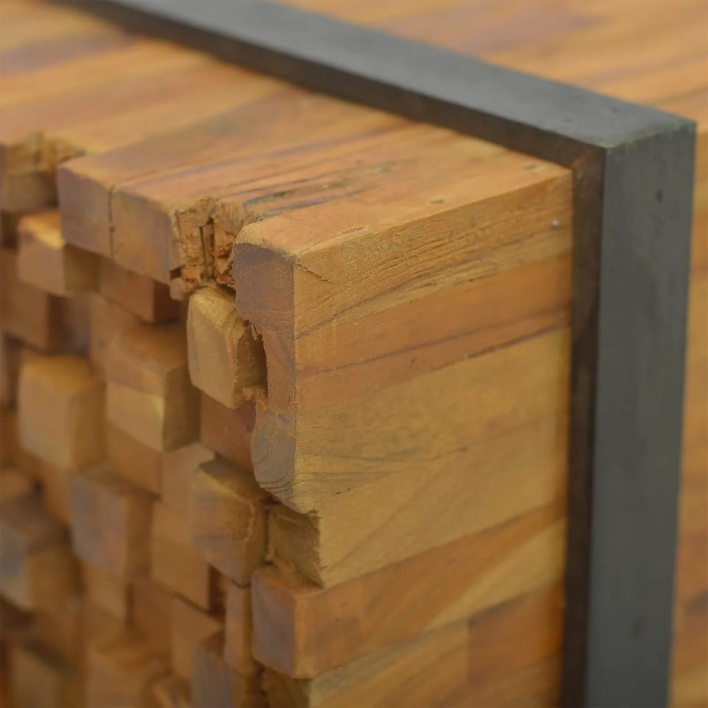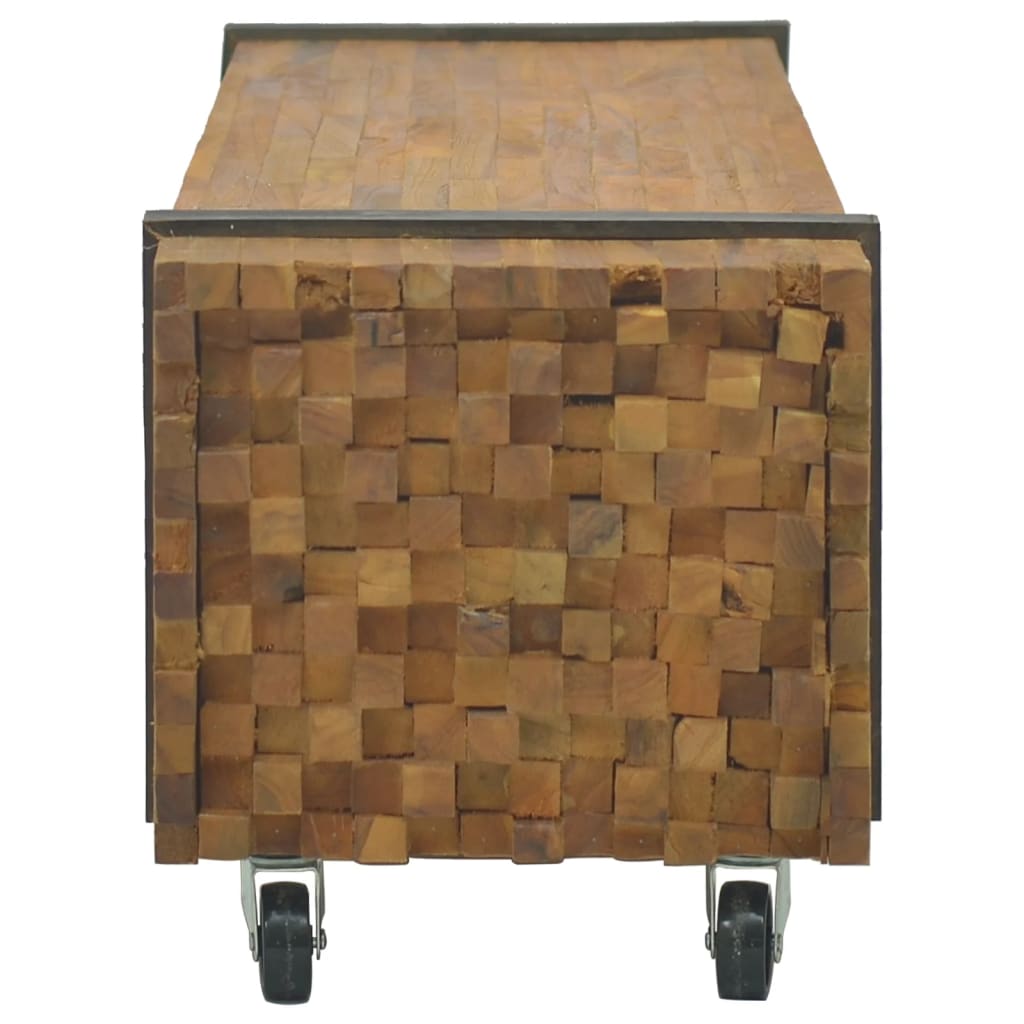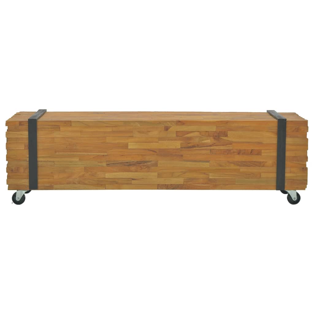 Clicnbuy vous propose : Ce meuble TV classique en bois présente un style industriel unique, ce qui en fait un complément idéal pour votre salon ou votre espace de divertissement. Il est également parfait comme une table basse, un buffet ou un buffet bas. Ce meuble TV robuste est fabriqué à partir de bois de teck pour ressembler à une pile de poutres maintenues ensemble par une paire de sangles noires. Son dessus robuste a amplement d'espace pour votre téléviseur ou vases, plantes en pot, paniers de fruits et autres objets décoratifs. La finition naturelle rend le meuble TV facile à nettoyer. Grâce à ses quatre roues, il est également facile à déplacer.
