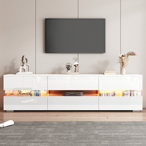 La façade entièrement brillante lui confère un aspect luxueux et moderne. Ce meuble TV est non seulement un meuble fonctionnel, mais aussi une pièce de design qui sublimera votre salon tout en le gardant organisé. La construction solide du meuble assure un positionnement stable de vos appareils électroniques et de vos décorations, tandis que l'élégant éclairage LED et la finition brillante créent une ambiance sophistiquée.