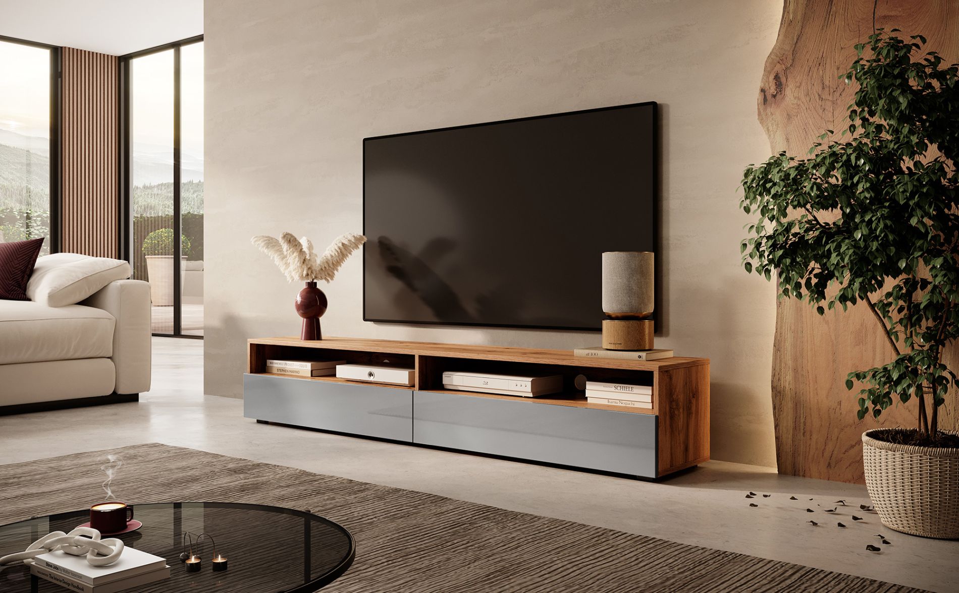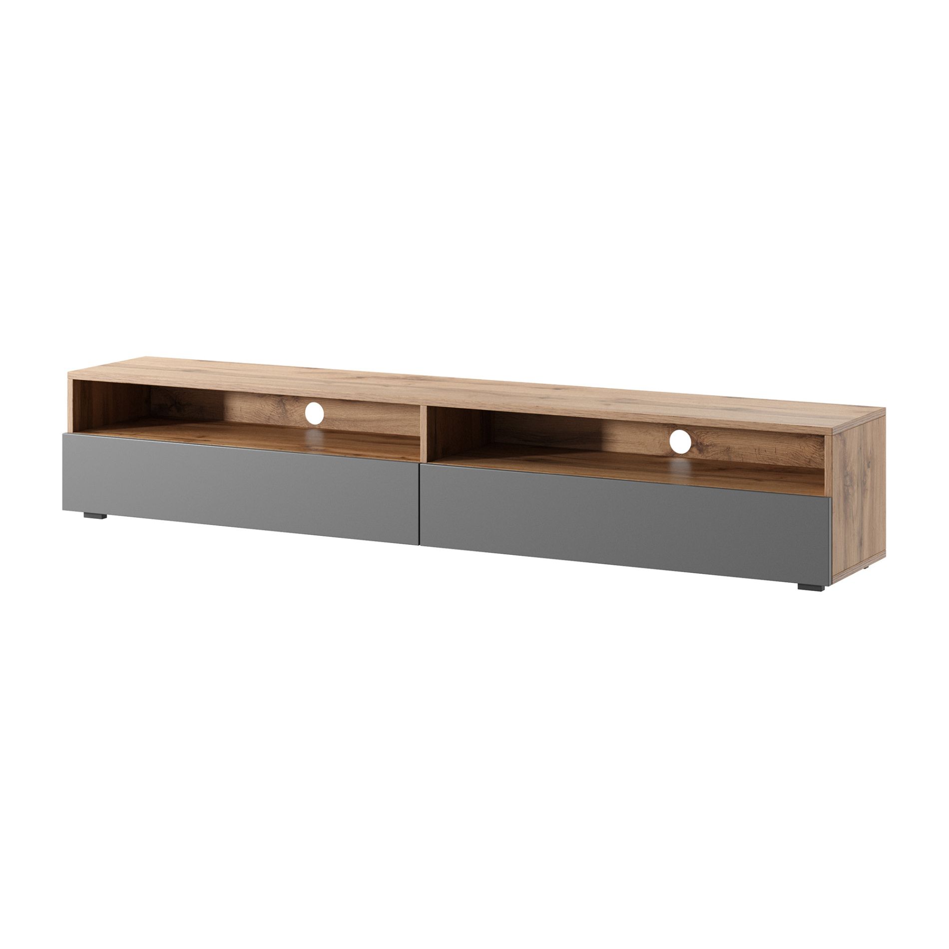 Meuble TV 180 cm chêne/gris brillant LED avec 2 compartiments REDNAW