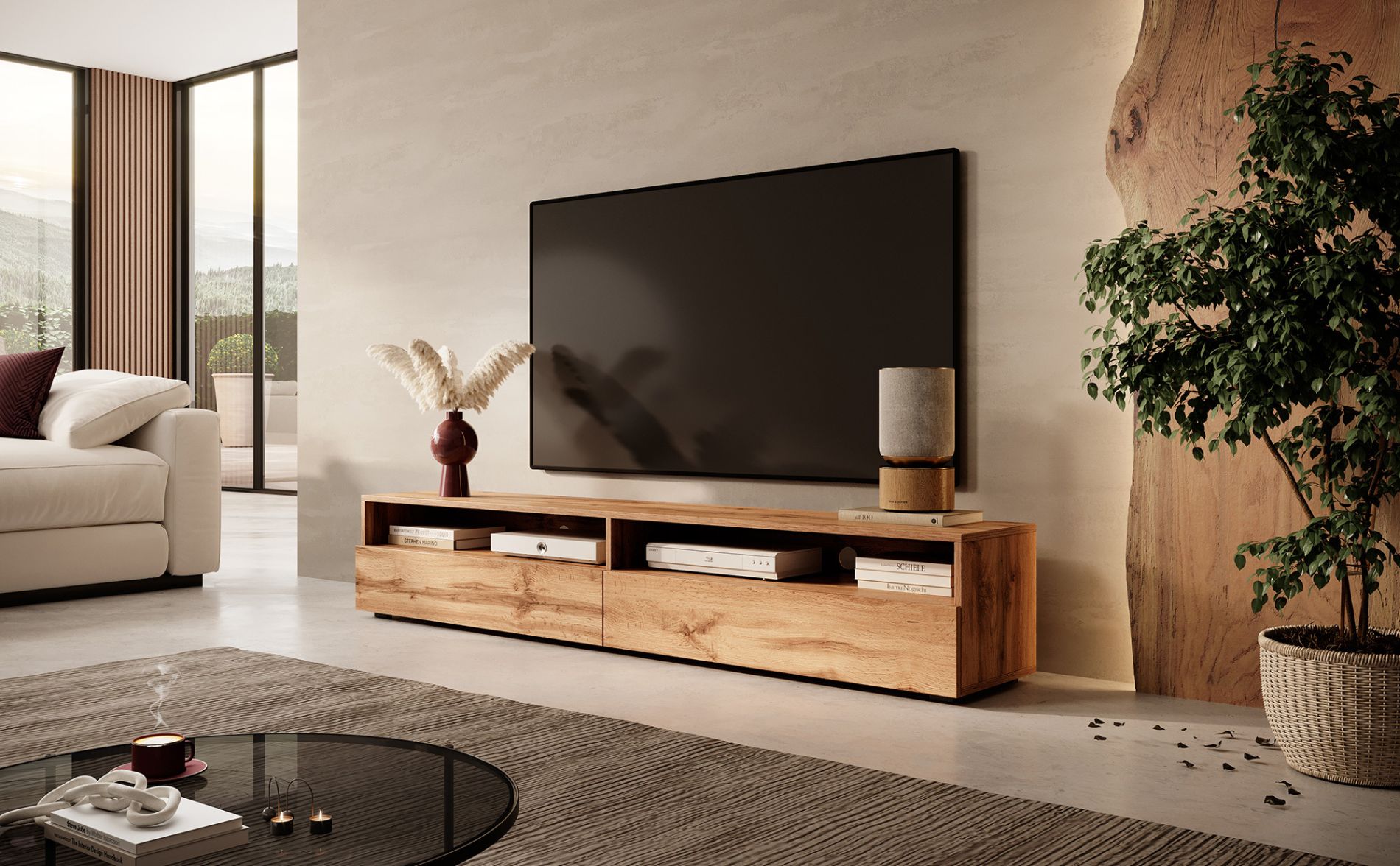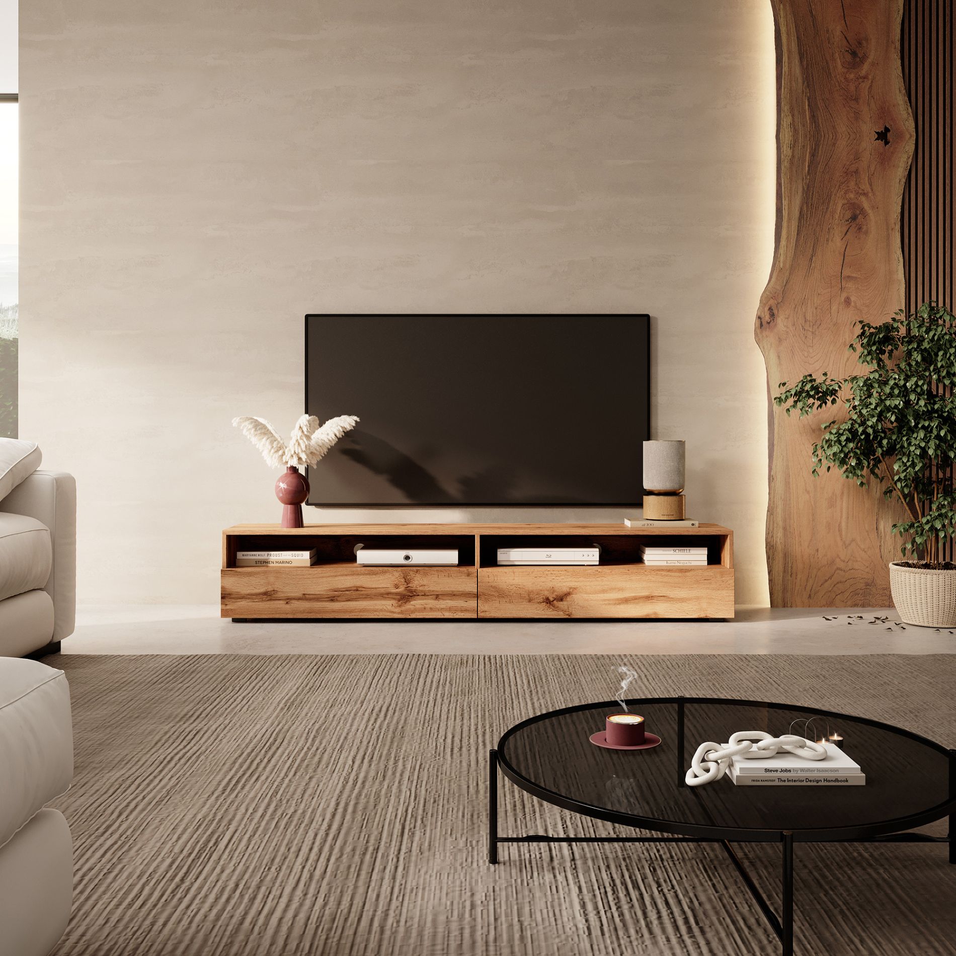Le meuble TV Rednaw ne fait aucun compromis sur la fonctionnalité : Les deux niches ouvertes offrent un espace pratique pour vos appareils du quotidien tels que récepteur, console de jeux ou boîtier multimédia. Grâce aux passe-câbles intégrés, la ventilation est optimale – vos équipements ne risquent pas de surchauffer. De plus, les signaux des télécommandes ou manettes restent sans interférences.
