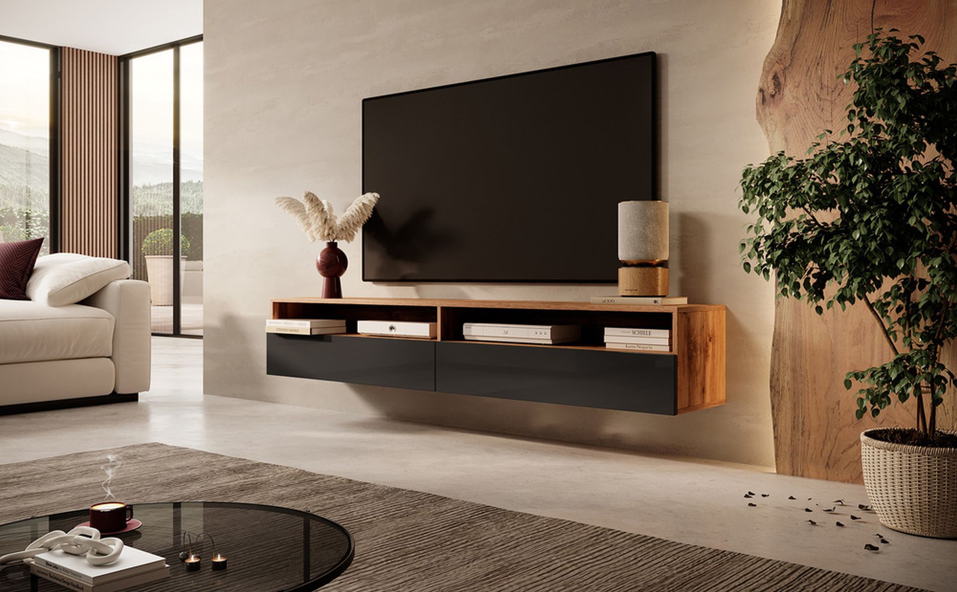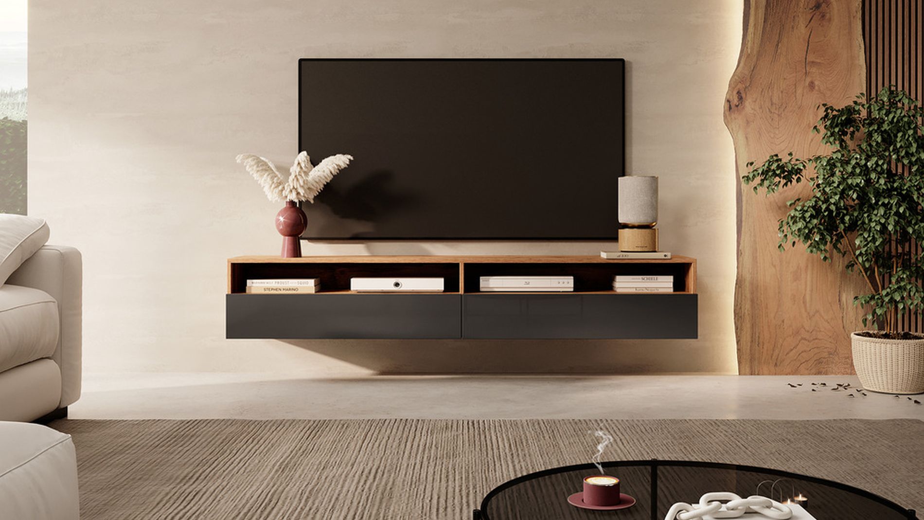 Le meuble TV Rednaw ne fait aucun compromis sur la fonctionnalité : Les deux niches ouvertes offrent un espace pratique pour vos appareils du quotidien tels que récepteur, console de jeux ou boîtier multimédia. Grâce aux passe-câbles intégrés, la ventilation est optimale – vos équipements ne risquent pas de surchauffer. De plus, les signaux des télécommandes ou manettes restent sans interférences.