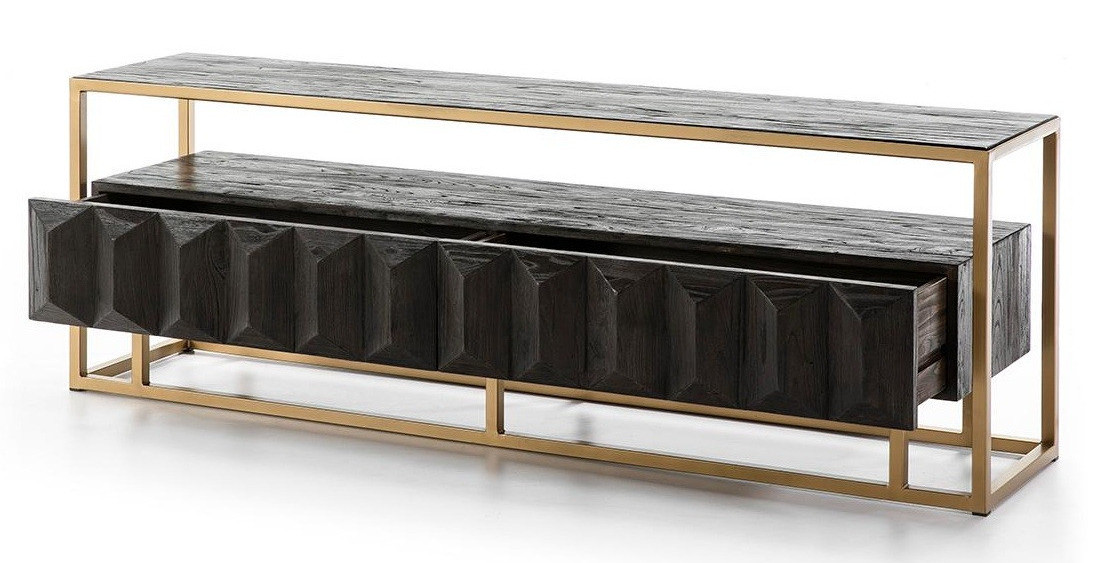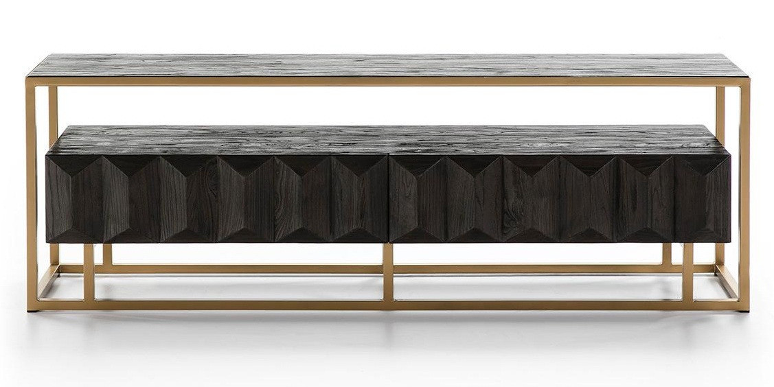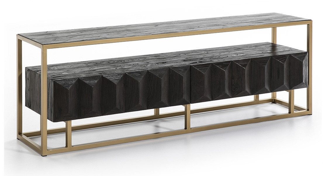 Meuble TV 2 tiroirs bois foncé et pieds métal doré 180cm
