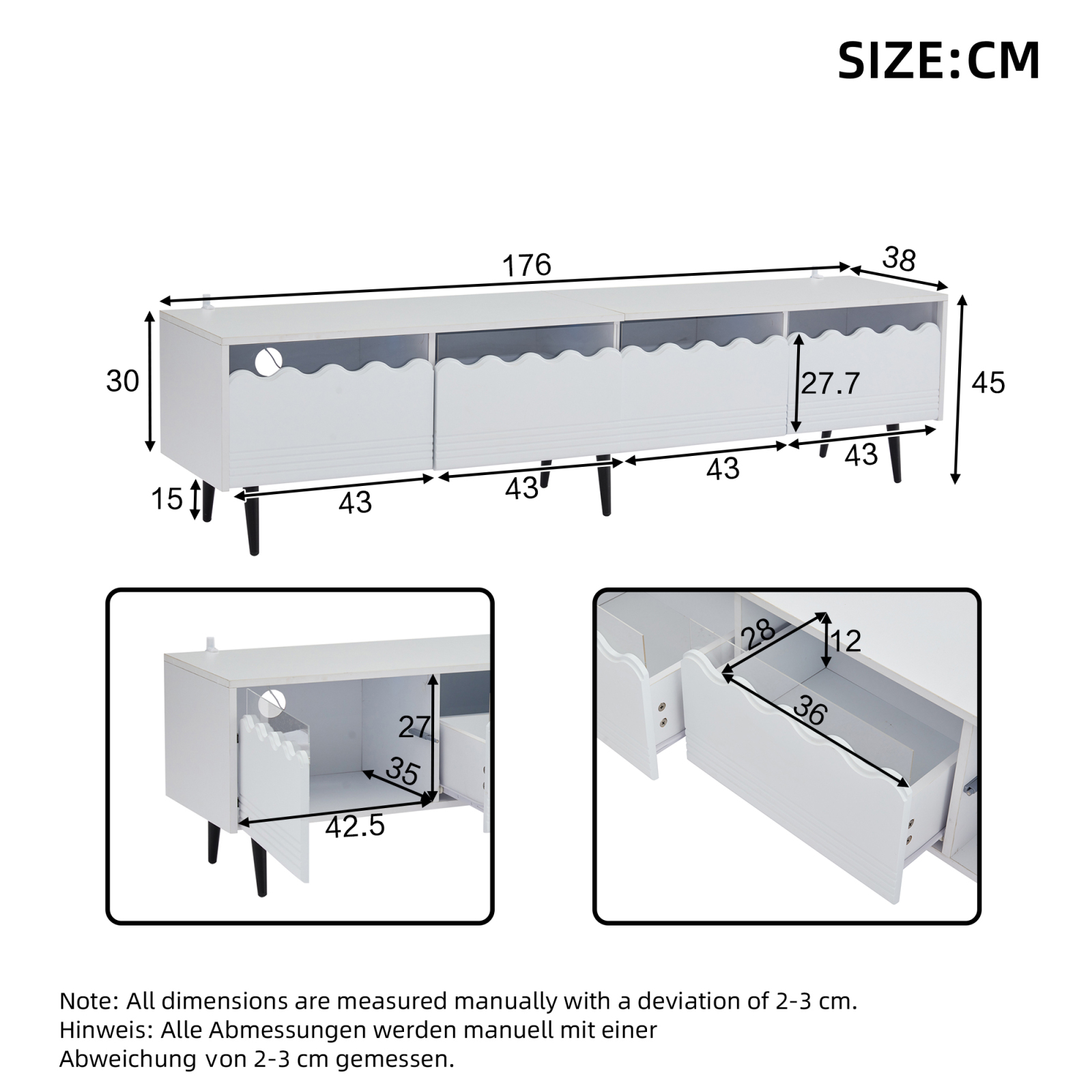 | Libellé | Meuble TV blanc 176 cm - 6 pieds, 2 tiroirs/2 portes - Support TV 75 pouces |