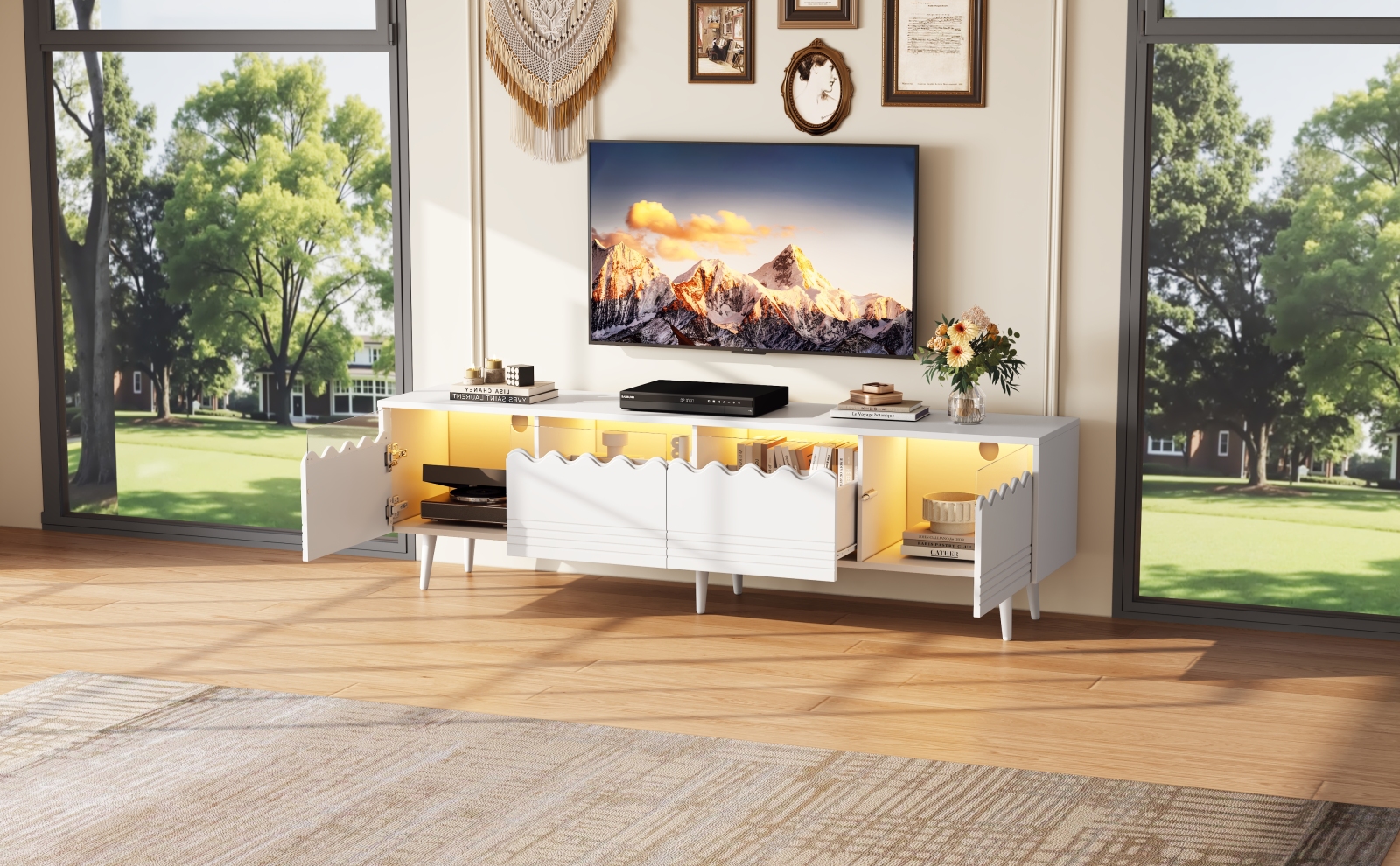 - Bandeau lumineux LED : Contrôlé par une application pour smartphone, le bandeau lumineux LED diffuse une lumière transparente à travers le verre trempé. Choisissez entre un bleu océan profond pour vos soirées cinéma ou un doré chaleureux pour vos fêtes, et faites de ce meuble TV la pièce maîtresse de votre salon.